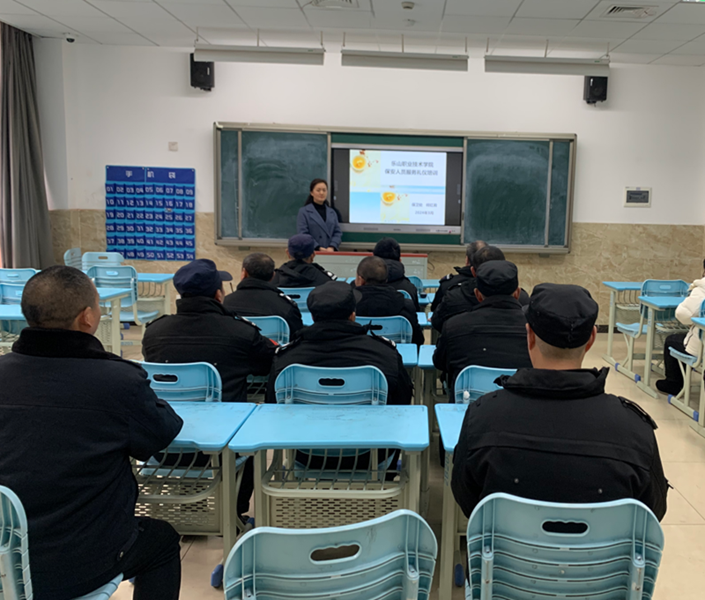此次培训分为两个部分。首先,何红莉老师围绕安保人员在执勤中的仪容仪表、礼貌用语、沟通技巧等方面进行讲解和说明,引导安保员塑造良好形象,切实提升服务水平与质量,促进学院安保工作规范化推进。