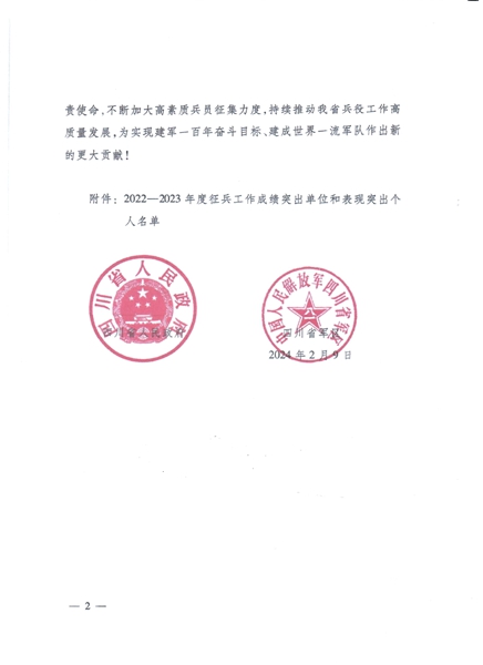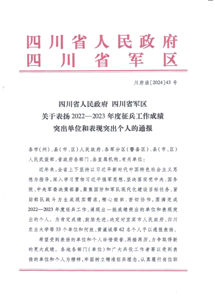 近日,四川省人民政府、四川省军区发布《关于表扬2022-2023年度征兵成绩突出单位和表现突出个人的通报》,伟德荣获全省大学生征兵工作成绩突出单位。