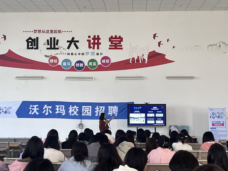 首先第一场是由来自良品铺子的hr罗红梅主讲,她讲述了毕业生能在良品铺子主要负责的工作以及能获得的福利,着重讲解了同学们在良品铺子实习的未来前景以及发展可能性,诚邀同学们到良品铺子实习。最后,同学们向主讲人进行了提问,并得到了细致地解答。第二场是由沃尔玛门店人力资源经理倪壤作为主讲人,会前首先让我们看了几个视频,使我们大致的了解了沃尔玛公司日常工作内容,随后以ppt的形式向我们讲解了沃尔玛公司的背景、工作环境、招聘岗位以及薪资待遇等。会议的最后,主讲人让有意向到沃尔玛实习的同学们扫码进群,后续会进行面试等。
