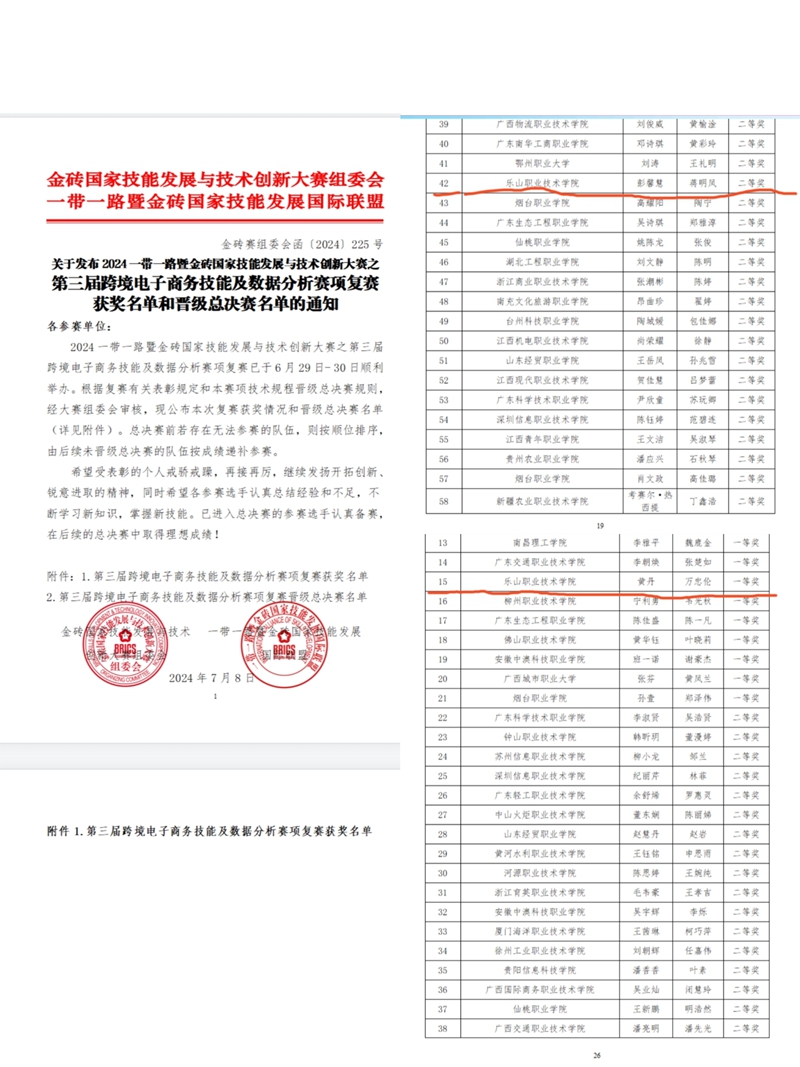 2024年6月29-30日,“2024一带一路暨金砖国家技能发展与技术创新大赛·第三届跨境电子商务技能及数据分析赛项全国复赛”在线上举办。该赛项复赛为跨境电商B2B和B2C实践赛,涵盖了店铺基础建设、产品刊登发布管理、客户管理、店铺营销、交易管理、履约服务等综合业务操作。伟德2022级电子商务专业学生黄丹、万忠伦团队获高职组一等奖,成功晋级全国总决赛;彭馨慧、蒋明凤团队获高职组二等奖。武会玲、王琪担任本次大赛指导老师。