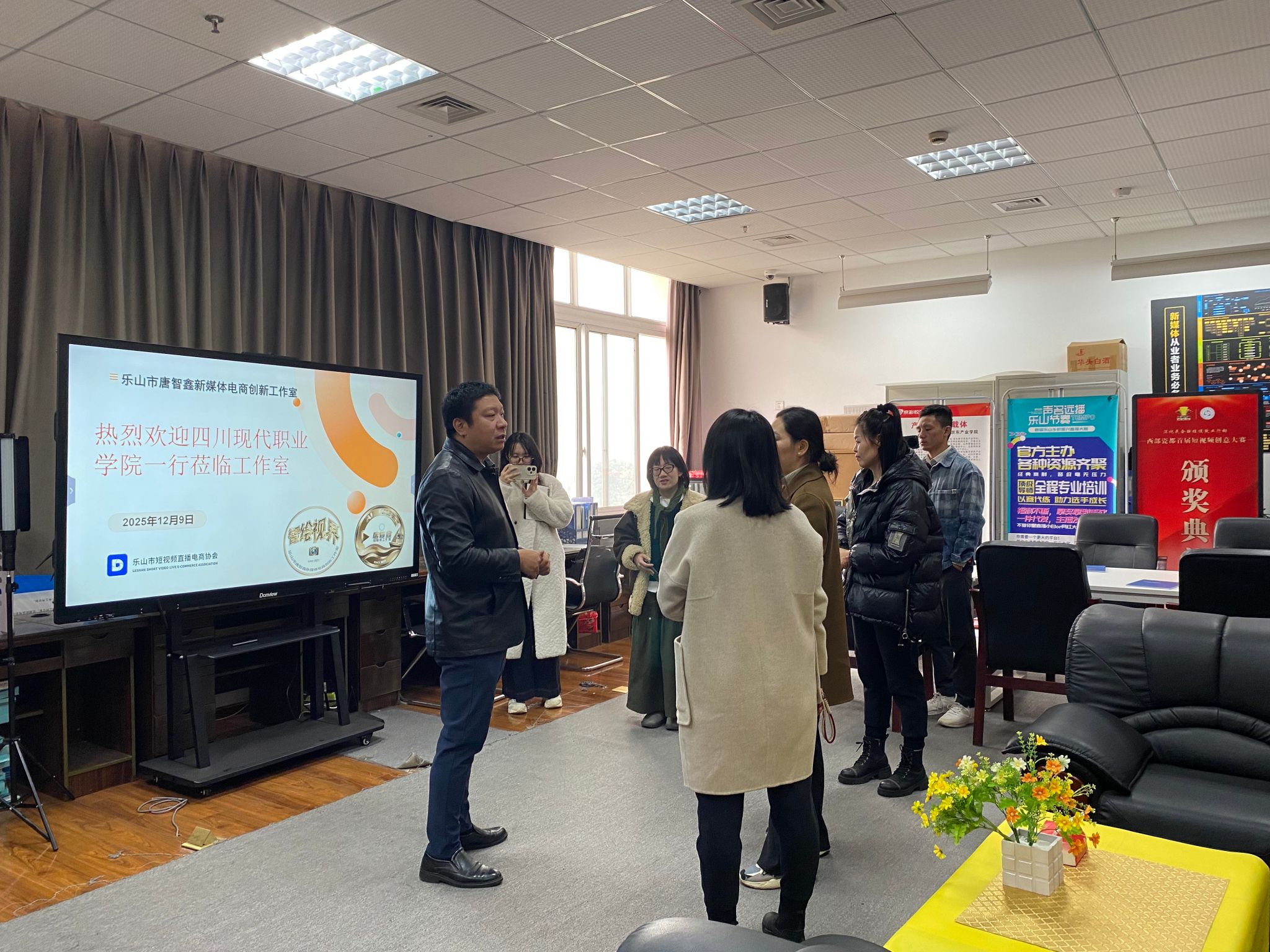 为深化新媒体电商领域产教融合实践,共享专业建设与人才培养优质经验,2025 年 12 月 9 日下午,四川现代职业学院数字经济学院数字媒体技术专业群负责人王贇带队,电子商务专业负责人于晶、骨干教师李怀瑾、黄丹青等一行 4 人,专程赴伟德国际victor1946数字经济与管理学院乐山市唐智鑫新媒体电商工作室开展交流学习。