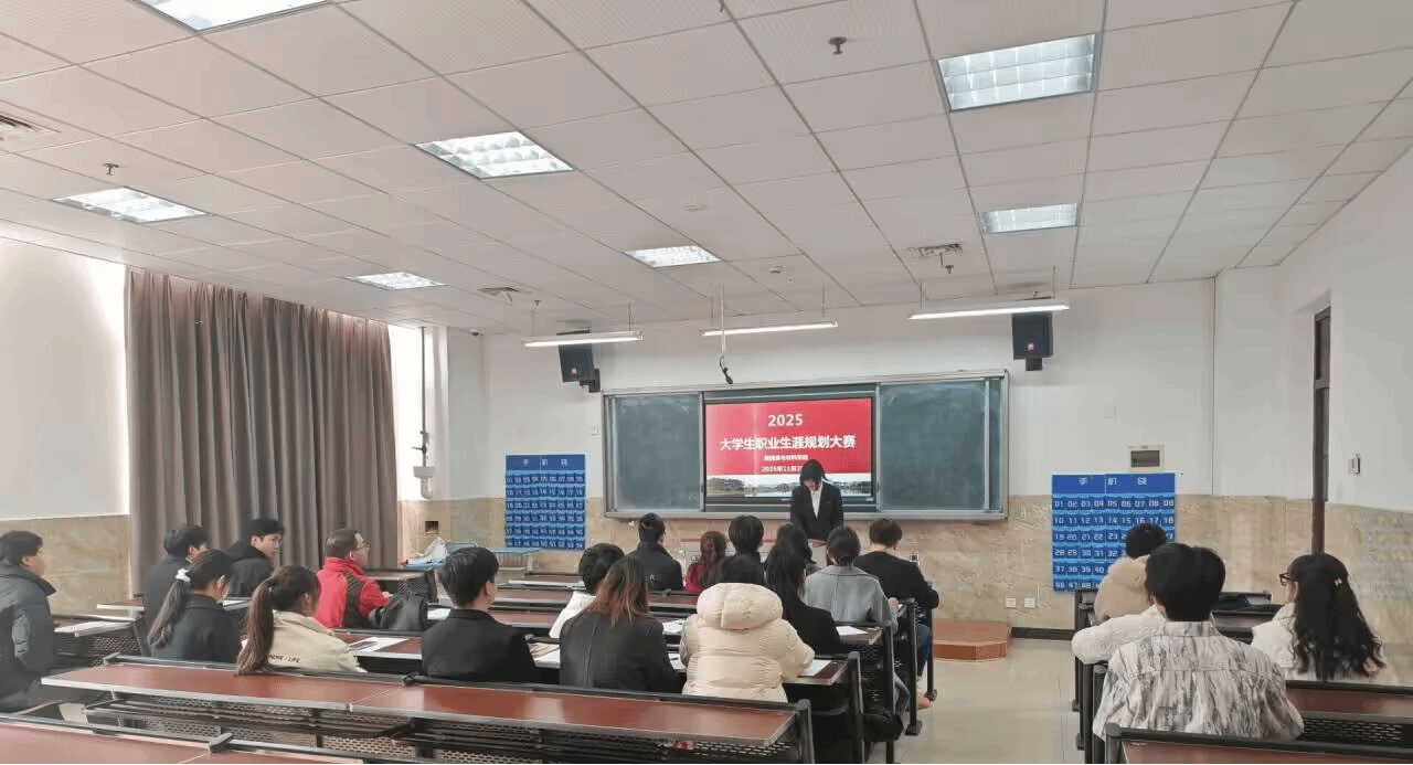 2025 年 11 月 28 日,新能源与材料学院大学生职业规划大赛在教学楼 1B107 举行。由刘秀琼教授、黄凯教授、刘思璇老师和辅导员李赟等组成专业评审团,20 名选手分就业与成长赛道竞技。