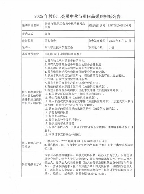 2025年教职工会员中秋节慰问品采购招标公告