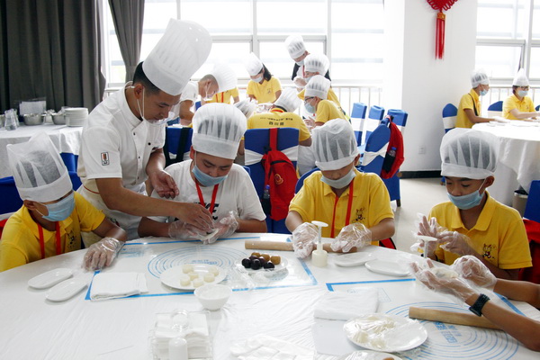“小饼如嚼月,中有酥与饴。”和面、分割、包馅、印模……在月饼制作现场,在大师傅手把手的指导下,营员们很快掌握了制作月饼的窍门。“看,我做的月饼还不错吧”他们对自己亲手做出来的月饼赞不绝口,纷纷掏出手机拍照留念,有的还把自己亲自制作的月饼递给老师品尝。