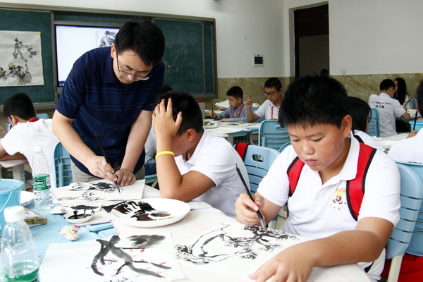 “飞透纸窗斜取势,吹回溪面舞因风。身游水墨画图中。”在国画课上,张雷、马世新老师用精心准备的课件,向营员们逐步展示中国画的魅力,讲座的过程中他们结合实物向营员介绍了笔、墨、砚、纸绢、颜料、毛毡等中国画画具。