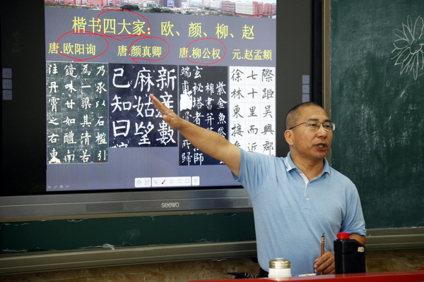 “兰亭茧纸入昭陵,世间遗迹犹龙腾。颜公变法出新意,细筋入骨如秋鹰。徐家父子亦秀绝,字外出力中藏棱。峄山传刻典刑在,千载笔法留阳冰。”书法课上,郑平从书法的发展历程、各个流派以及书法所需的文房四宝为营员们做了深入浅出的讲解,着重介绍了以王羲之和颜真卿为代表的书法大家,并给营员们展示了许多书法家的作品。