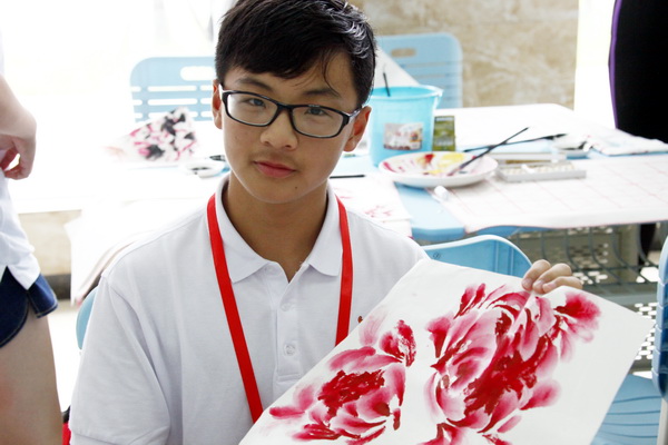 洗笔、蘸水,使笔中含水量达到适中,在老师们的带领下,营员们学习用“水带墨”的方法画出浓淡自然的枝干,再用同样的方法画出颜丽的牡丹。在学习牡丹画法的同时,感受着“唯有牡丹真国色,花开时节动京城”的盛世繁华。