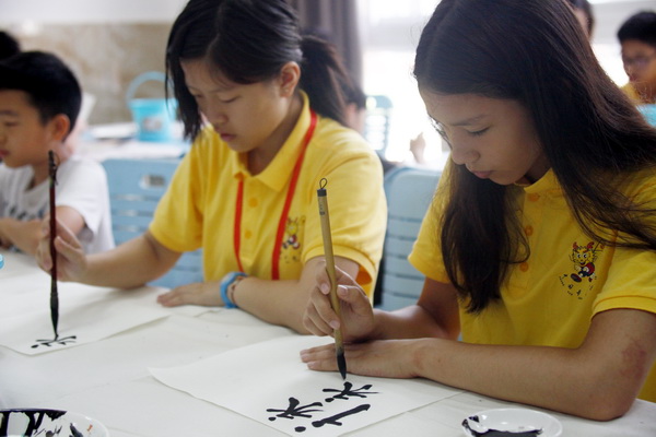 随后,郑平拿起准备好的毛笔和墨汁,为营员示范如何写出漂亮的书法作品。为了让每一个营员更好地理解,郑平会长还特意多次强调了握笔、蘸墨及运笔的技巧。