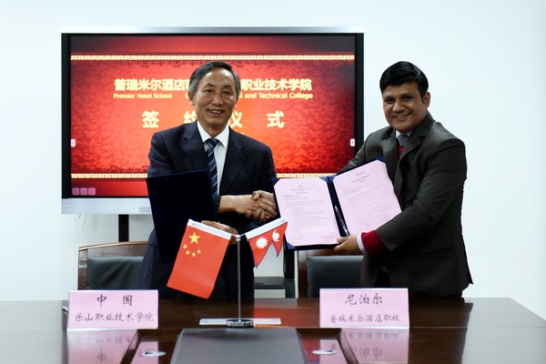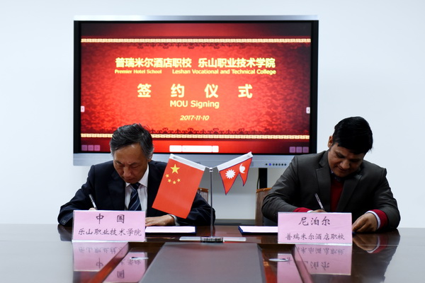 2017年11月10日,尼泊尔普瑞米尔酒店职校校长苏尼尔(Sunil Kumar Bhusal)一行来访我院,双方在424会议室举行了交流座谈。学院党委书记蹇路,党委副书记陈芝海,国合处、人事处、教务处、基础公共课程部、旅游系相关负责人,及普瑞米尔酒店职校在我院学习(现在金海棠大酒店实习)的4名尼泊尔籍留学生参加了交流座谈。会议由党(院)办主任、国合处处长黄晓莉主持。 会上,蹇路代表学院与苏尼尔(Sunil Kumar Bhusal)校长签署了合作协议。