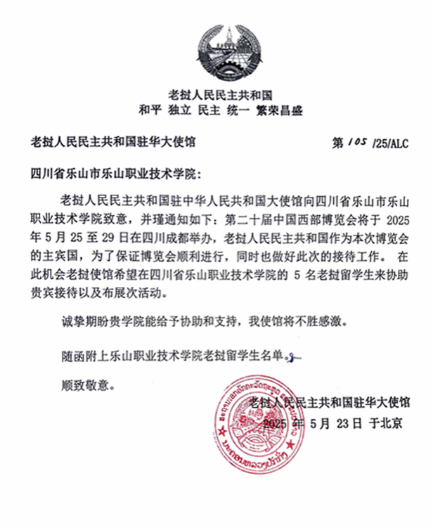 近日,伟德国际victor1946收到老挝人民民主共和国驻华大使馆发来的正式函件,专程邀请伟德5名优秀的老挝籍留学生,参与5月25日-29日第二十届中国西部国际博览会的贵宾接待与展馆布展工作。这封特殊的邀请函,标志着伟德国际victor1946在澜湄区域国际化人才培养领域获得官方认可,成为四川省首个获老挝驻华使馆专项邀约参与国家级展会服务的高职院校。