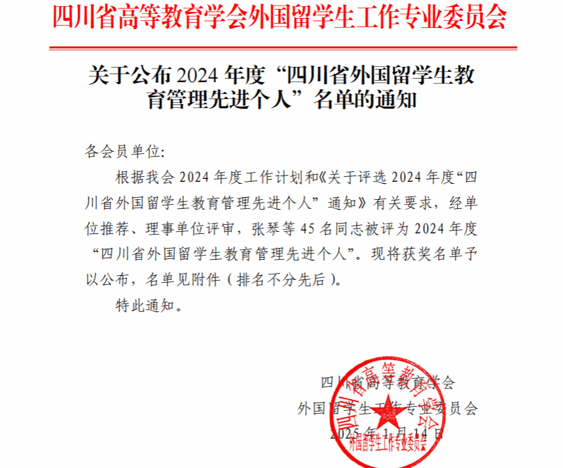 根据四川省高教学会外国留学生工作专业委员会评优工作部署,伟德于2024年12月依规开展“外国留学生教育管理先进个人”前期选拔工作。经专委会依据既定评审标准,对申报材料及工作成绩进行细致严谨评审,伟德教师卢妮娜、邱科最终获授2024年度“四川省外国留学生教育管理先进个人”荣誉称号。