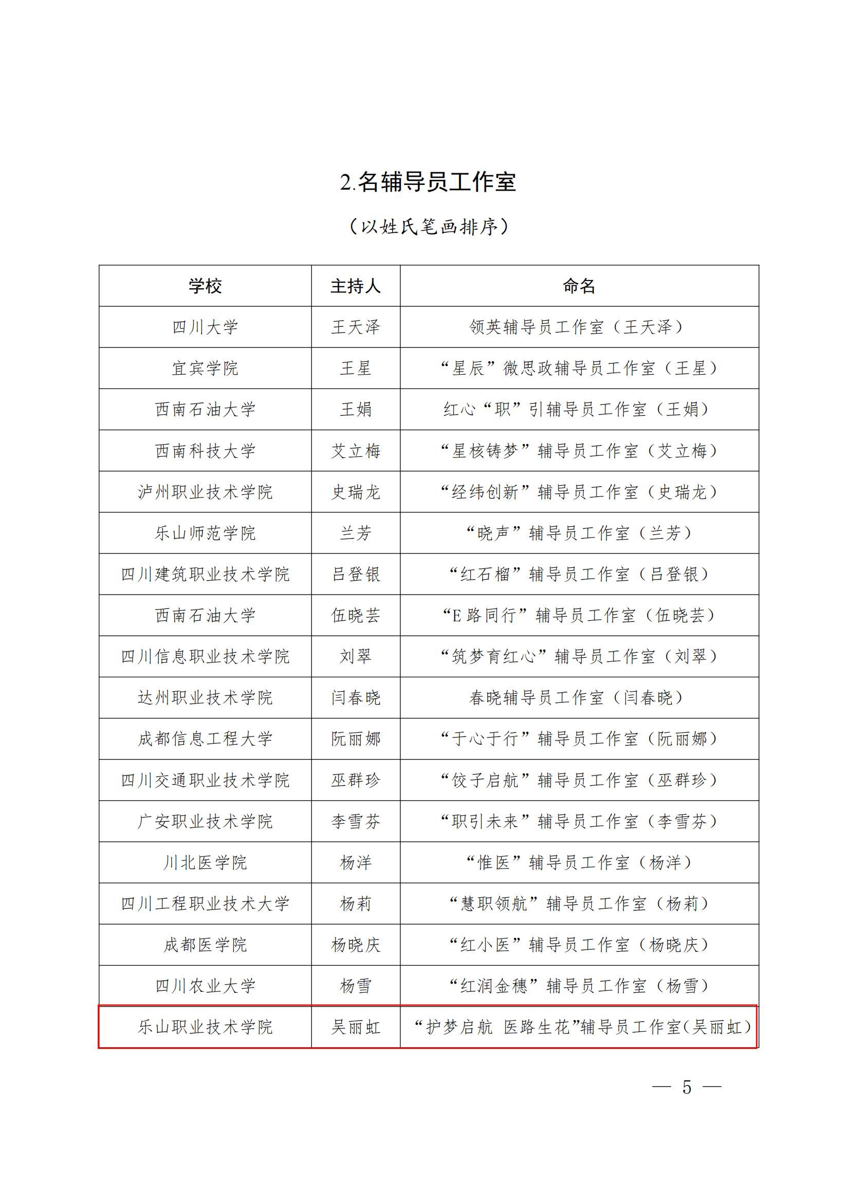 The "Hu Meng Qihang, Yi Lu Sheng Hua" (Setting Sail in Nursing, Blooming in Medical Journey) Counselor Studio, hosted by Wu Lihong from the Nursing and Health Care College of Leshan Vocational and Technical College, has been selected as one of the "Model Counselor Studios for Ideological and Political Education in Higher Education Institutions." This is the first time that a counselor studio from our school has been selected into the provincial list of model counselor studios, and it represents a landmark achievement in the construction of our school's counselor team.