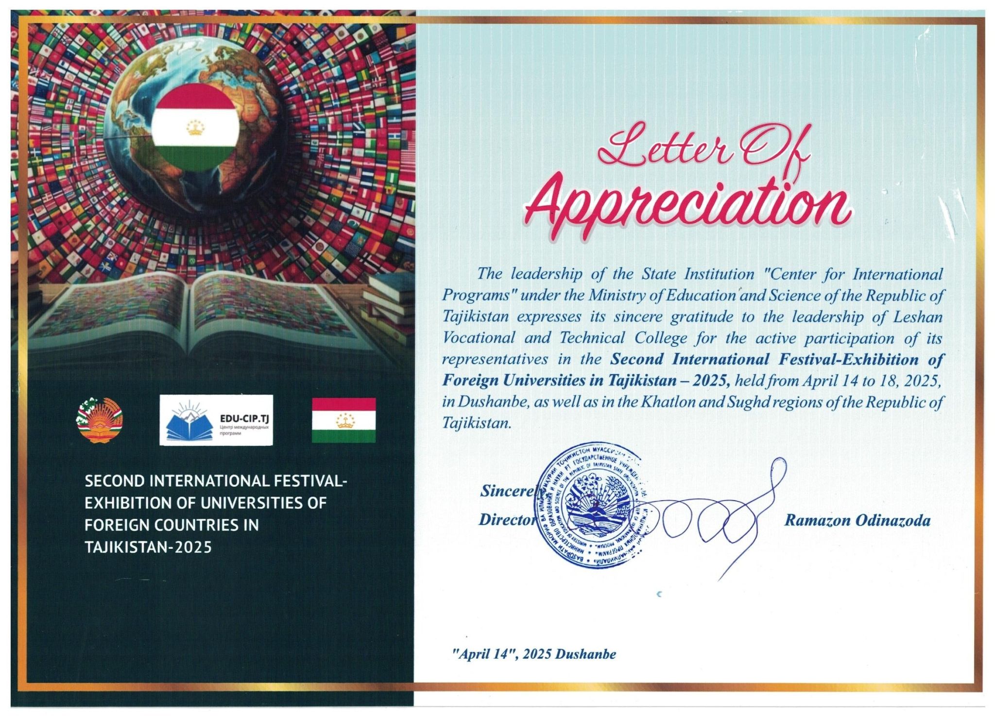 From April 14th to 18th, 2025, at the invitation of Ramizov Odinazoda, Director of the International Programs Center under the Ministry of Education and Science of the Republic of Tajikistan, a delegation from Leshan Vocational and Technical College traveled to Tajikistan to participate in the "2025 China-Tajikistan Vocational Education Cooperation Seminar and the Second International Education Exhibition of Tajikistan". During this international event, Leshan Vocational and Technical College not only showcased its outstanding achievements in the field of vocational education but also received multiple honors and certificates.