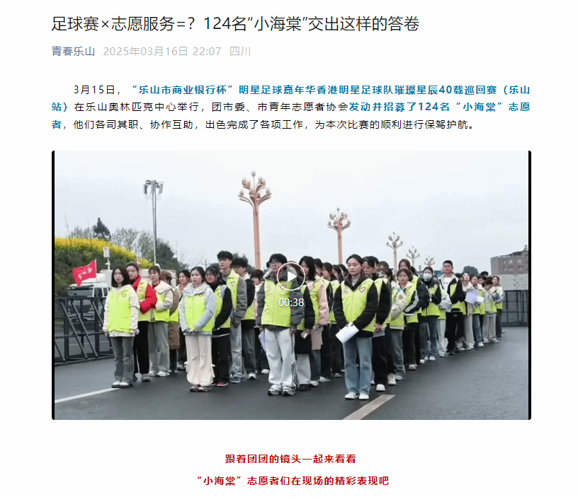 On March 15th, the "Leshan Commercial Bank Cup" Star Football Carnival, featuring the Hong Kong Star Football Team's 40th-anniversary tour match (Leshan leg), was held at the Leshan Olympic Center. The Youth League Committee of Leshan Vocational and Technical College mobilized and recruited 120 volunteers. These volunteers, each fulfilling their respective roles and working collaboratively, successfully completed all assigned tasks and ensured the smooth progress of the event.