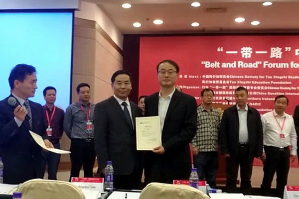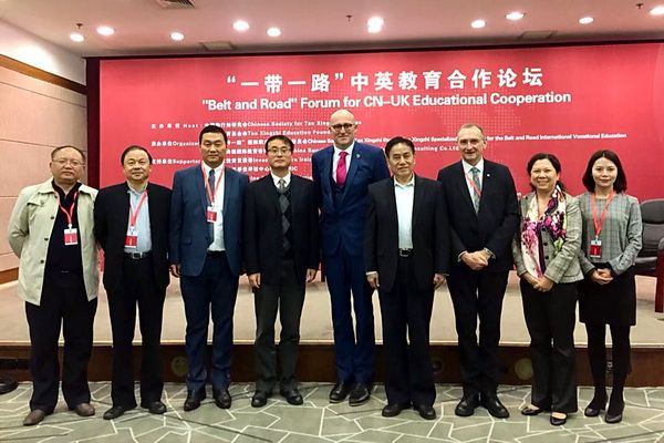 On October 23 - 24, 2018, President Liu Zhong, Director Zhang Zhigui of the Academic Affairs Office, hired expert Ma Zhiqun from the Medical and Nursing Department, and Deputy Director He Dehong of the International Cooperation Office, were invited to attend the "Belt and Road" China - UK Education Cooperation Forum in Beijing. The forum was held at the Beijing Jiuyou Xinyuan Hotel and was hosted by the Chinese Tao Xingzhi Research Association and the Tao Xingzhi Education Foundation.