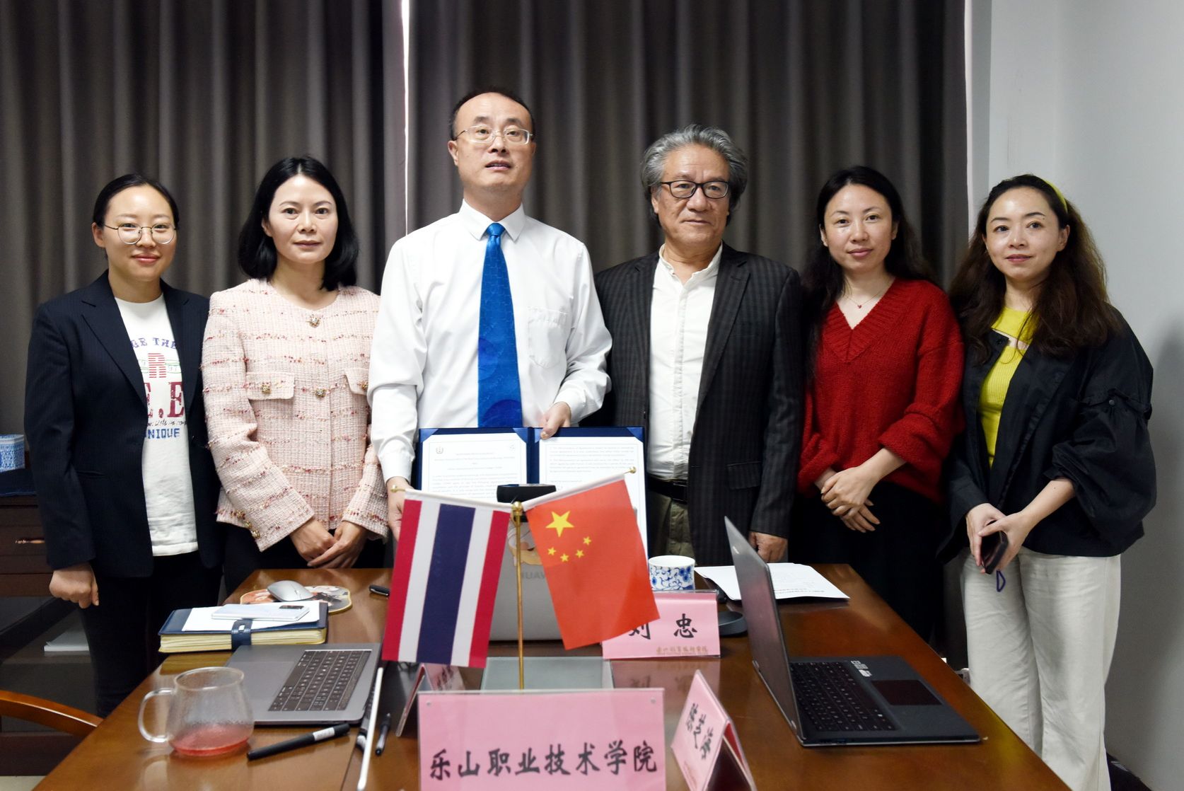 On the afternoon of October 11th, Leshan Vocational and Technical College held a Zoom video conference with the Thai Red Cross Nursing College (hereinafter referred to as "STIN") and signed a Memorandum of Understanding (MOU) on site. Attending and participating in the signing ceremony were Kanogwan Suwanpatikorn, Principal of STIN; Vilailert Komton, Vice Principal; relevant persons in charge of international cooperation; Liu Zhong, Principal of Leshan Vocational and Technical College; Chen Zhihai, Deputy Secretary of the Party Committee and Chairman of the Trade Union; heads of the Academic Affairs Office; and relevant personnel from the International College.