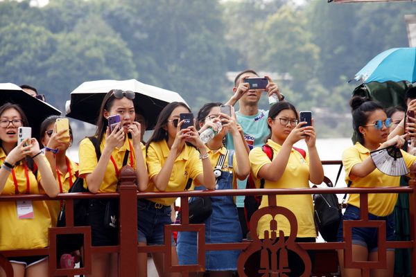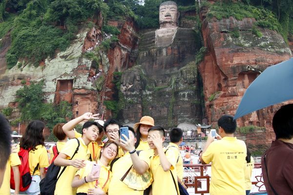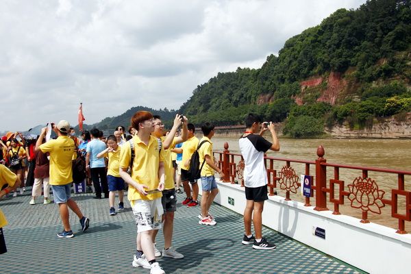 Upon arriving at the Baxian Cave Dock, the participants lined up neatly and orderly under the guidance of their counselors to board the ferry. As the whistle blew and the ferry set sail, the participants took out their mobile phones to capture the beautiful scenery of Leshan along the riverbanks. When the ferry reached the foot of the Giant Buddha, the participants were both awestruck and delighted as they gazed up at the 71 - meter - tall Leshan Giant Buddha. They eagerly took photos with the 1,216 - year - old statue to commemorate the moment.