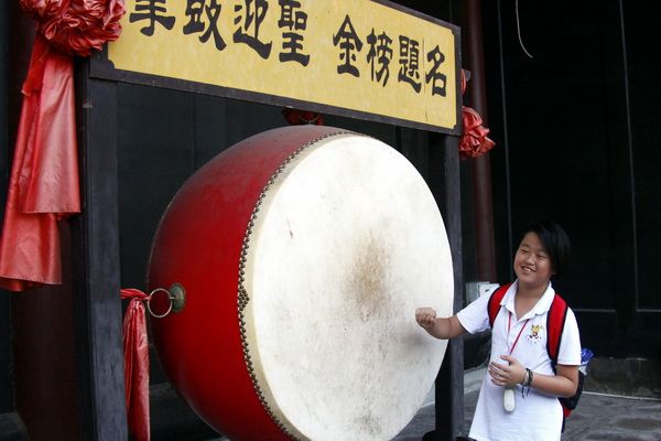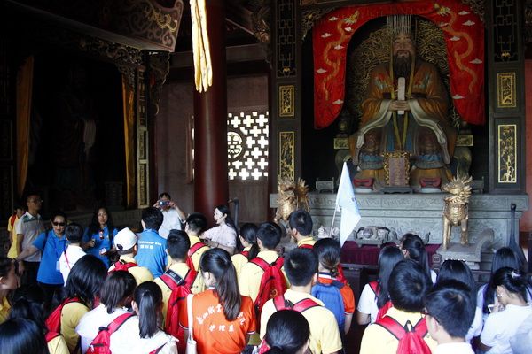 At 2 p.m., they arrived at the second destination of the day—the Jianwei Confucius Temple. Despite the scorching sun, the children were immediately attracted by the ancient and tranquil atmosphere as soon as they entered the temple. They divided into groups and, under the guidance and explanation of the staff, further learned about the history and culture of the temple and the etiquette of worship. In front of a big drum inscribed with "Top - Ranking in the Imperial Exams," the children experienced hitting the drum with their hands. The drum's sound echoed continuously.