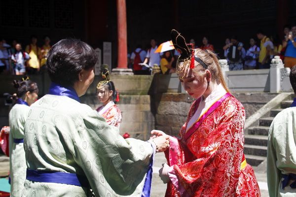 As an important part of the "2019 China Roots - Seeking Journey" Summer Camp in Leshan, Sichuan, the coming - of - age ceremony followed the ancient system, with hand - washing, incense - burning, and wine - pouring. With the support of the master of ceremonies and the crisp and melodious music, Wulan presented a hairpin to her daughter Xijier and performed the coming - of - age ritual for her.