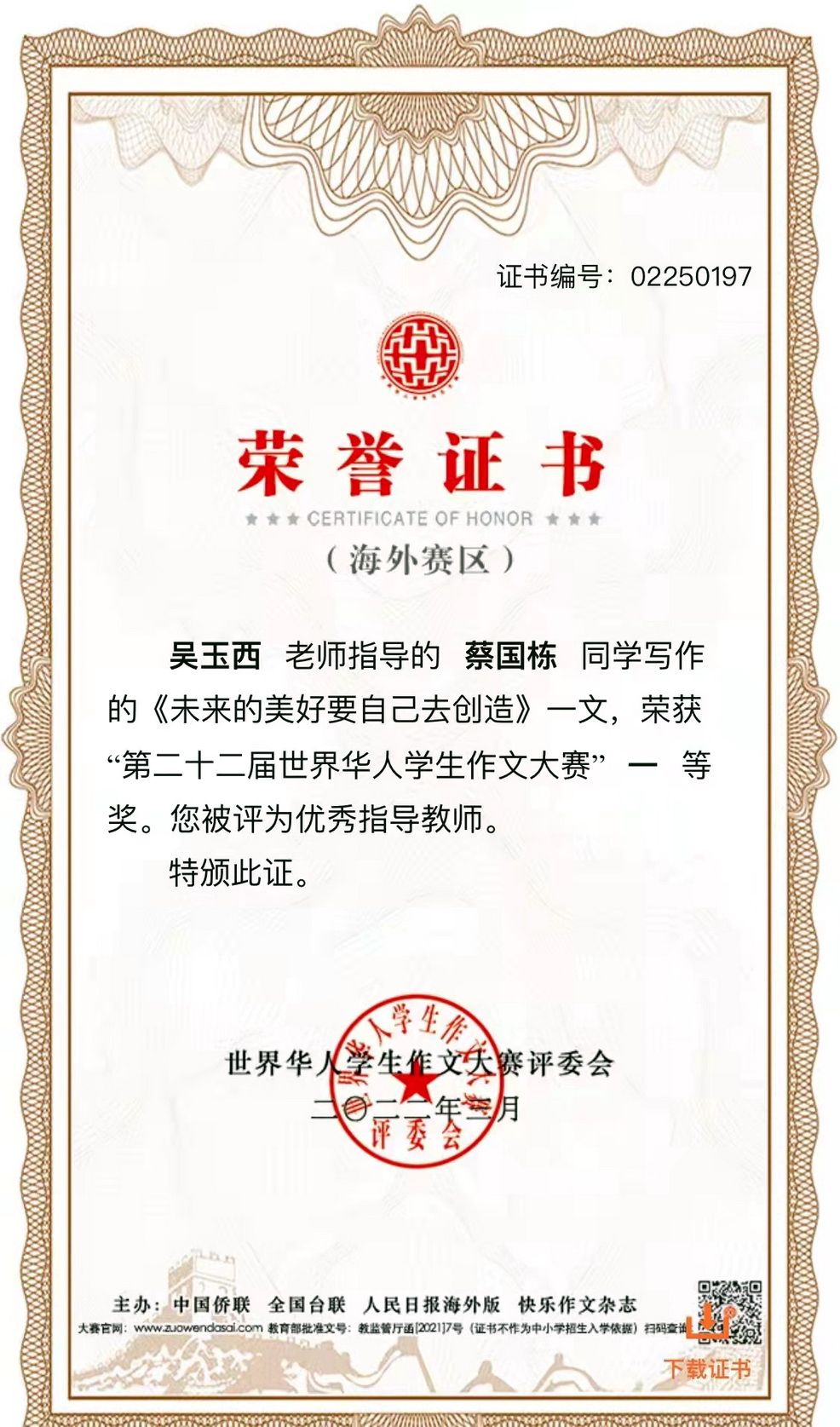 The 22nd World Chinese Students' Composition Contest was jointly organized by the All-China Federation of Returned Overseas Chinese, the Taiwan Democratic Self-Government League, the Overseas Edition of the People's Daily, and the Happy Composition magazine. Since its launch in September 2021, the contest lasted for over six months and attracted more than 3 million Chinese students from 45 countries and regions.