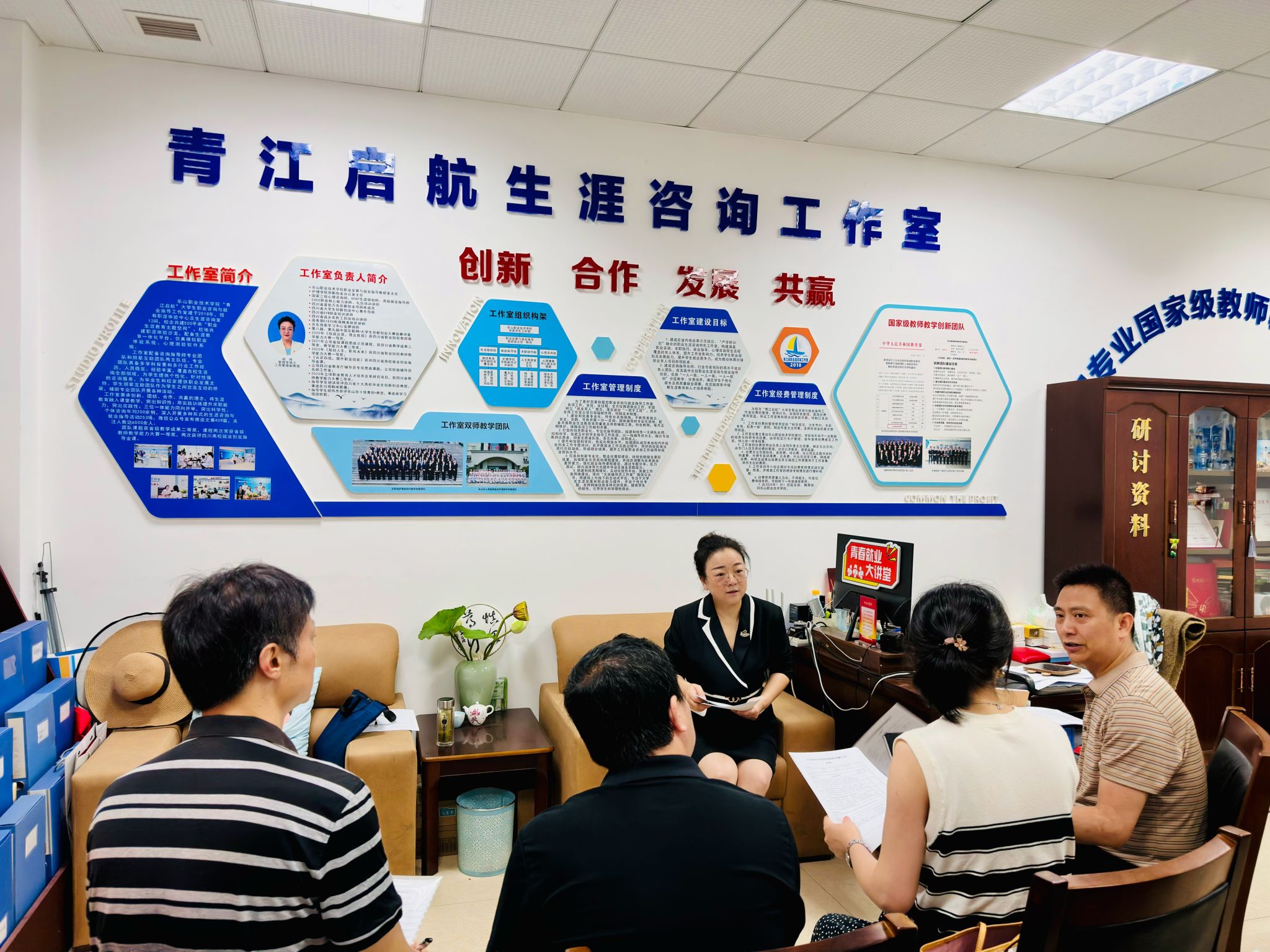 在一个小时的深度交流中,双方围绕“Z世代”高职学生特质展开思维碰撞。“青江启航”省级职业生涯咨询特色工作室负责人杨鸿老师现场剖析新生代高职生“就业黏性低”“职业认知浅”等特质。针对个体咨询效能薄弱问题,重点解码“行业认知+岗位实践+职业决策”的三阶成长模型。当谈及产教衔接痛点时,其展示的“一生一档、一生一策”学生生涯档案引发到访教师们的关注。质量工程学院“返岗教研”团队则介绍了该校在第二课堂和就业指导方面的创新工作和特色亮点。