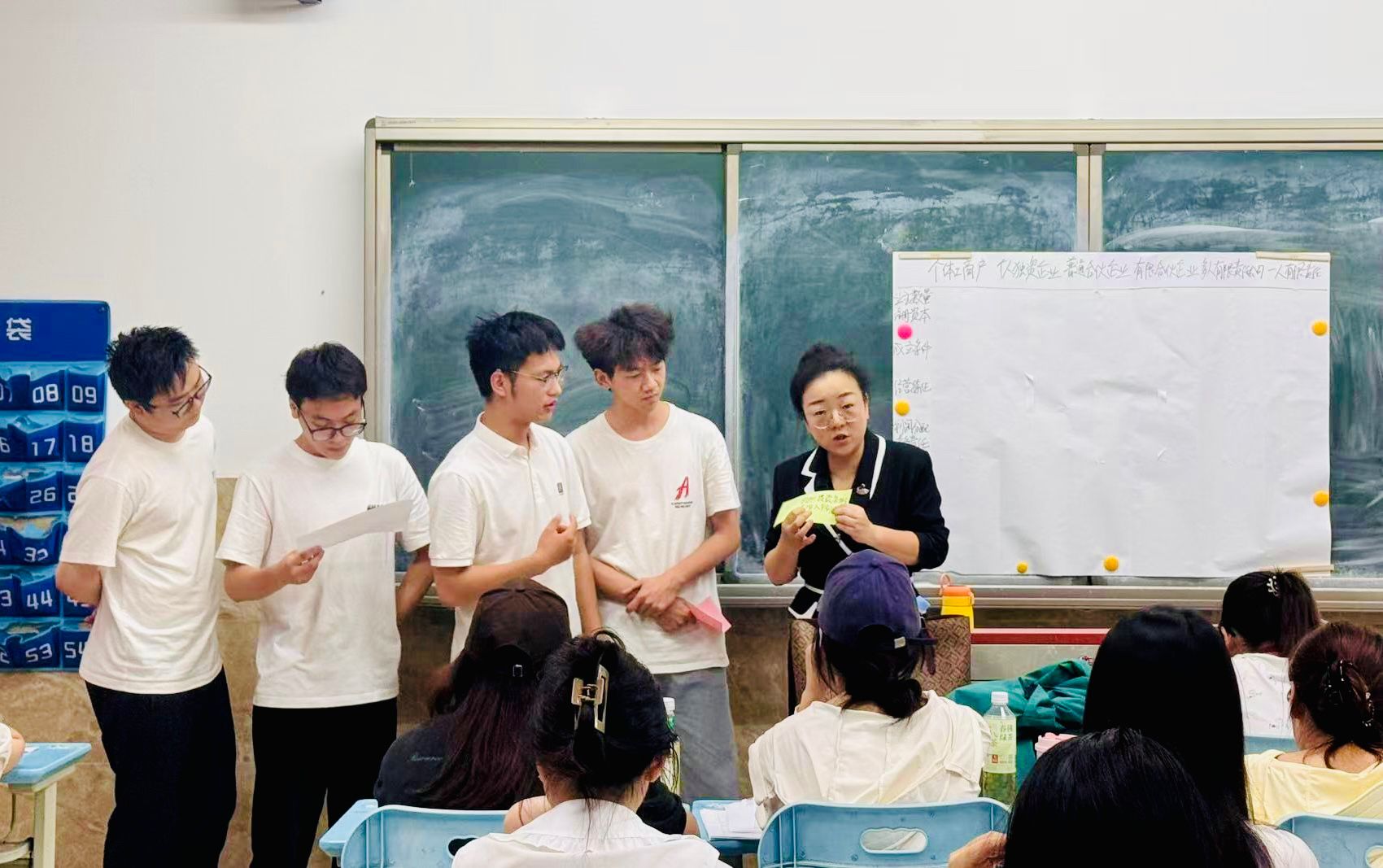 第二堂课创新采用“沉浸式普法工作坊”模式,将枯燥的法条转化为“创业者必修课”。在“妙记法条有高招”环节,学生用顺口溜记忆小微企业常见法律形态核心条款,更通过“企业形态连连看”游戏,用思维导图梳理个体工商户、有限合伙等法律形态的差异。课堂实时数据显示,学生对课程知识目标要求掌握的核心条款的即时掌握率达95.8%。