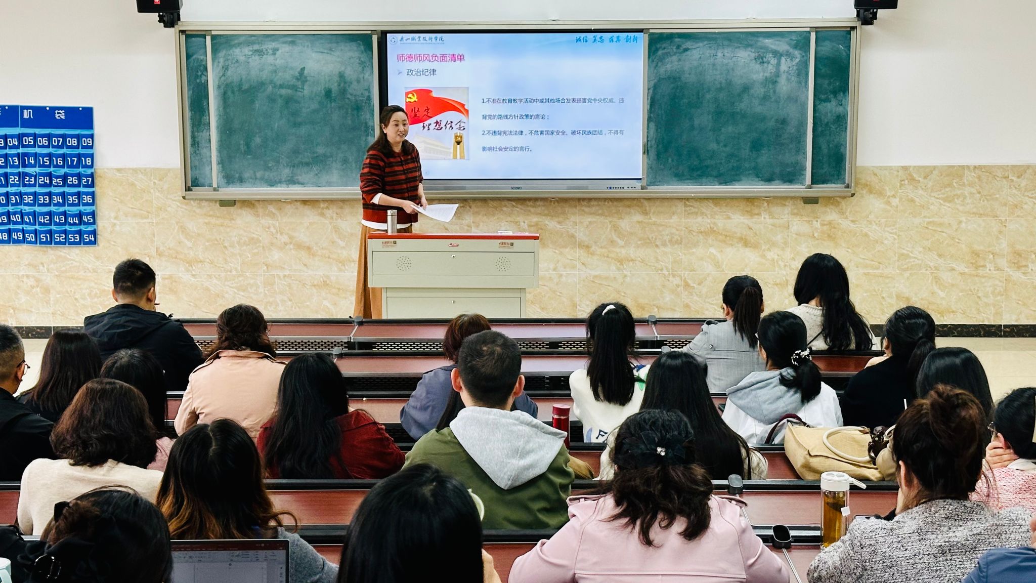为深入贯彻落实新时代教师队伍建设要求,进一步提升教师思想政治素质和职业道德水平,2025年10月22日下午,伟德国际victor1946护理康养学院组织全体教职工在2C302开展了师德师风专题学习培训。本次培训围绕学校近期印发的《伟德国际victor1946教师师德失范行为处理办法》(乐职院通〔2025〕63号)和《伟德国际victor1946教师师德评价考核办法》(乐职院通〔2025〕64号)展开,旨在引导教师严守职业底线,争做“四有”好老师。