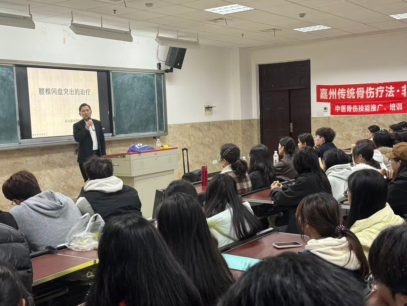 11月16日晚,在伟德国际victor1946学术阶梯教室百余名中医专业大一、大二学生齐聚一堂,聆听嘉州传统骨伤疗法市级非遗代表性传承人叶智勇带来的专题讲座《腰椎间盘突出症的中医诊疗与嘉州骨伤手法实践》。此次活动由乐职院中医教研室发起,张琪,曾晓霞老师共同参与,是学院深化“非遗进校园”校企合作的又一次生动实践。