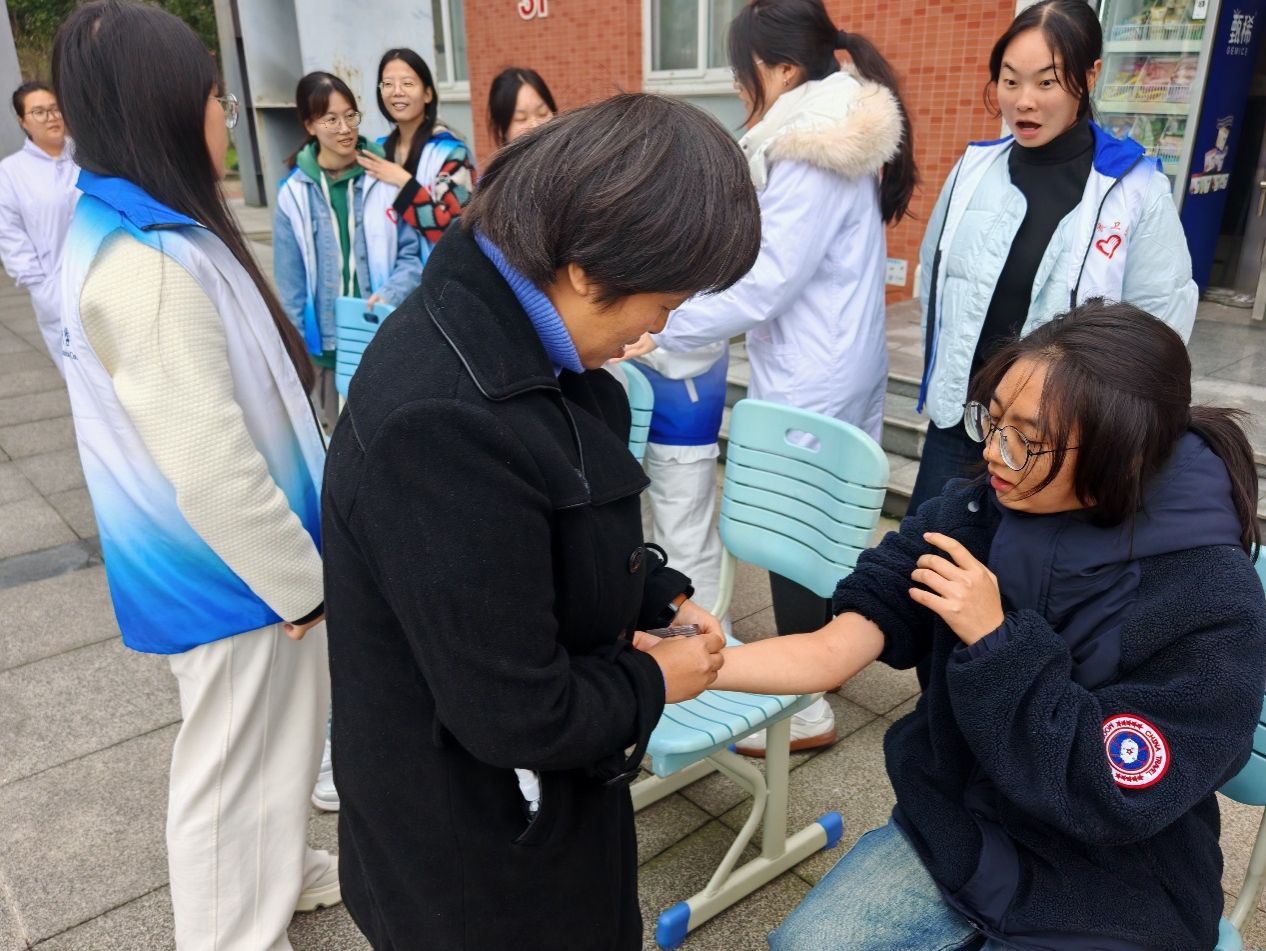 活动现场秩序井然,志愿者们分工明确、配合默契,以饱满的热情投入到各项服务中。免费血压测量区前,志愿者们细致记录数据,耐心解答师生关于血压健康的疑问;艾灸体验区内,淡淡的艾草香气氤氲飘散,志愿者们针对肩颈不适、疲劳乏力等问题,为身体不适的师生开展温和舒缓的艾灸调理,尤其关注长期伏案学习工作的师生,精准缓解其肩颈酸痛困扰;按摩区里,志愿者们运用课堂所学的推拿手法,动作娴熟、力道适中,精准揉捏穴位,让每位体验者都倍感放松,连连称赞 “手法专业,太舒服了”。