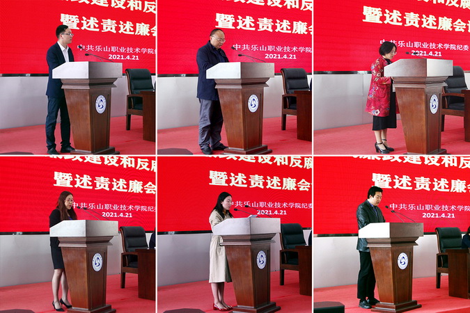会议还开展了2020年述责述廉工作,学院副院长鲍学东,医护系主任张知贵、后勤处处长张舸、科技处处长王丽、教务处处长陈晓露、旅游系党总支书记朱文彬登台述责述廉,陈述一年来的工作成效、存在的问题及原因,并接受学院纪委委员和纪委办工作人员现场质询,并以无记名投票方式对全院中层以上领导进行民主测评。
