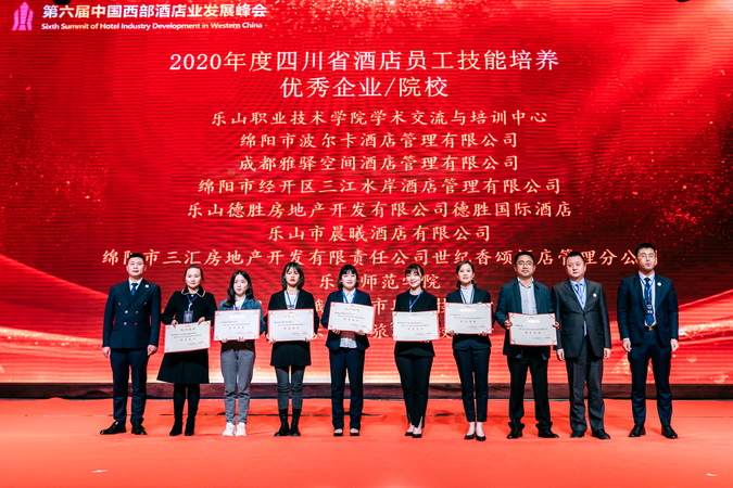 会上,学院张舸同志荣获 “2020年中国西部酒店业年度人物”奖,学院学术交流与培训中心被评为“2020年度四川省酒店服务技能培养优秀企业”,四川酒店职教联盟中的5所学校被授牌“四川酒店人才培养基地”。