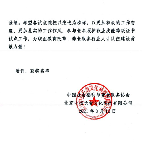 近日,学院收到中国社会福利与养老服务协会《关于对2020年度教育部1+X老年照护职业技能等级证书试点院校(西南部片区)进行表彰的决定》,决定授予伟德国际victor1946老年照护职业技能等级证书试点工作“突出贡献奖”。