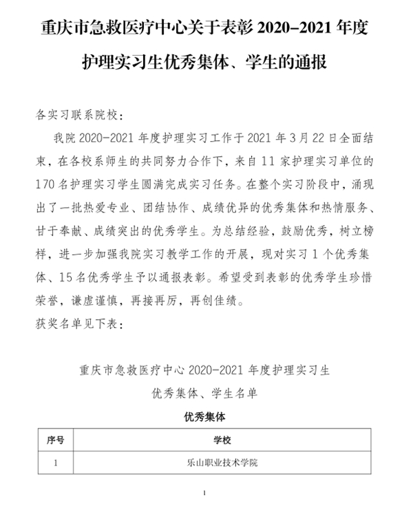 近日,我院护理系2021届护理专业重庆市急救医疗中心实习小组在众多学校实习小组中脱颖而出,被授予“2020-2021年度护理实习生优秀集体”荣誉称号!