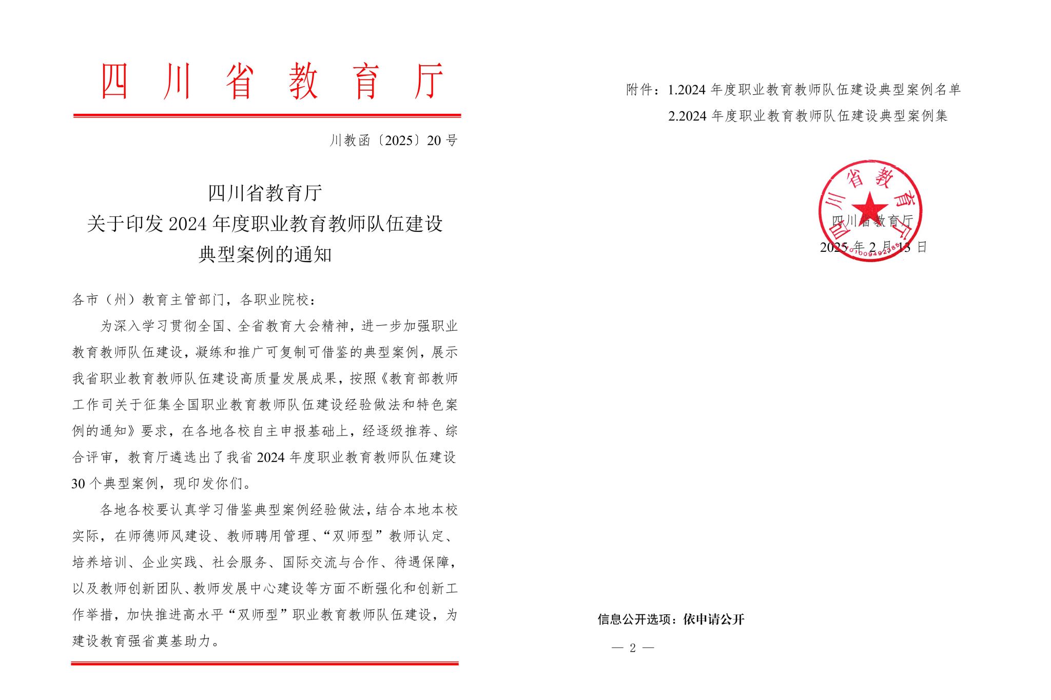 为进一步加强四川省职业教育教师队伍建设,凝练和推广可复制、可借鉴的典型案例,展示我省职业教育教师队伍建设的高质量发展成果,2月13日,四川省教育厅发布了《2024年度职业教育教师队伍建设典型案例集》,共评选出30个典型案例。伟德《文化引领 平台支撑 项目驱动,打造“阳光之师”职业教育教师创新团队》成功入选。