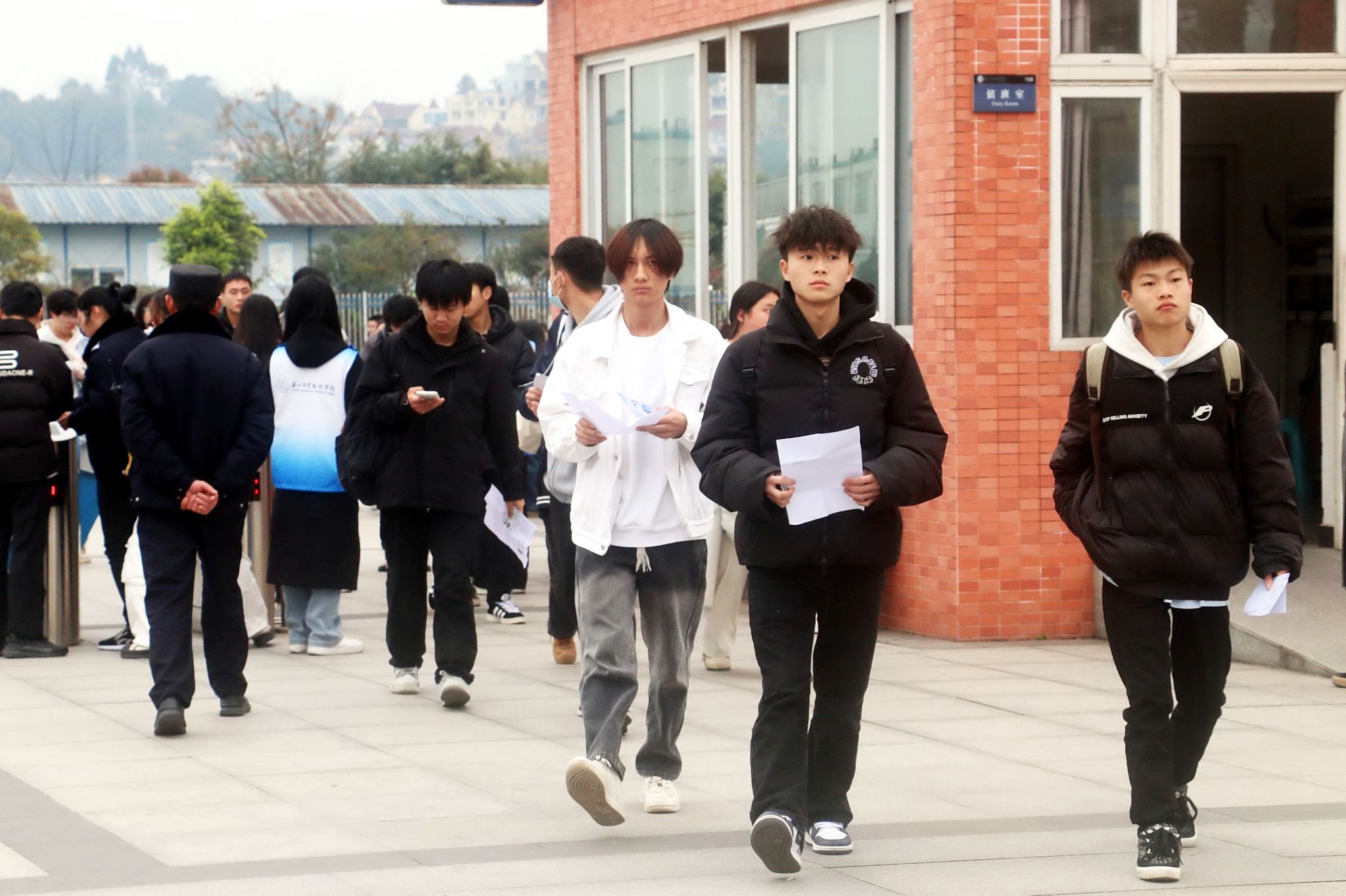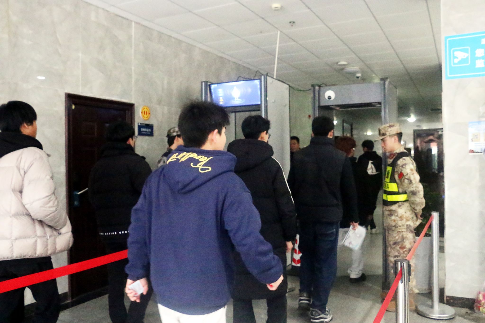 直至8点,考点内工作人员开始陆续分批组织考生们进入考场,只见考生们排起长龙大队,在工作人员的引导下,先将手机、充电器等电子产品放入手机柜,放置好书包后再正常通过“智能安检门”进入考场,现场一切安排得井井有条。待9点开考铃响起,考生们开始答题,监考老师严格执行考试规则,确保考试过程严谨、公正进行。