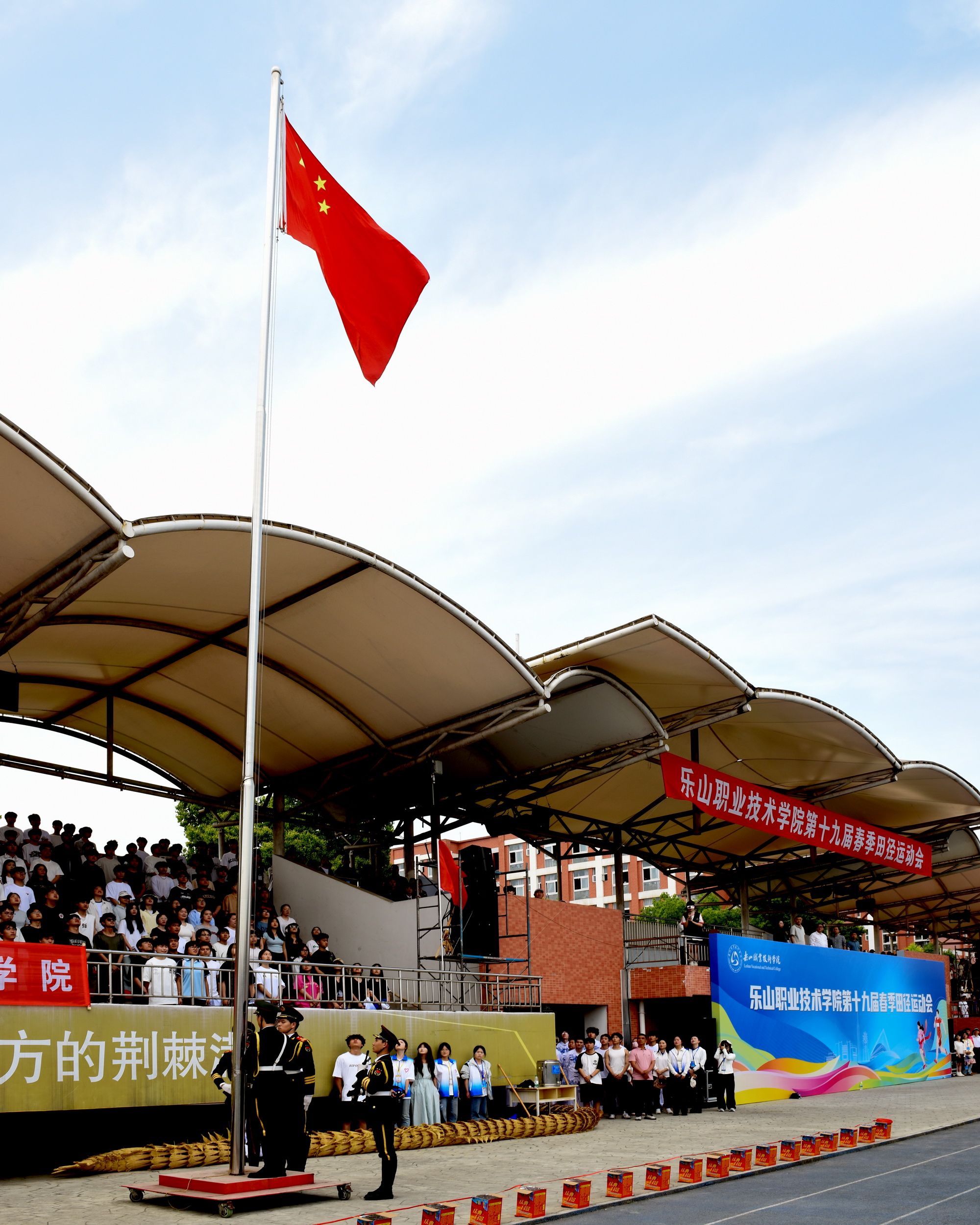 开幕式上,各二级学院代表队和机关教工代表队在国旗、校旗和会旗的引领下,伴随着运动员进行曲,踏着整齐的步伐、精神抖擞地步入会场。各二级学院代表队在经过主席台时作短暂停留,进行了各具特色的风采展示。入场式后,举行了庄严的升国旗仪式,全场师生起立,奏唱国歌。