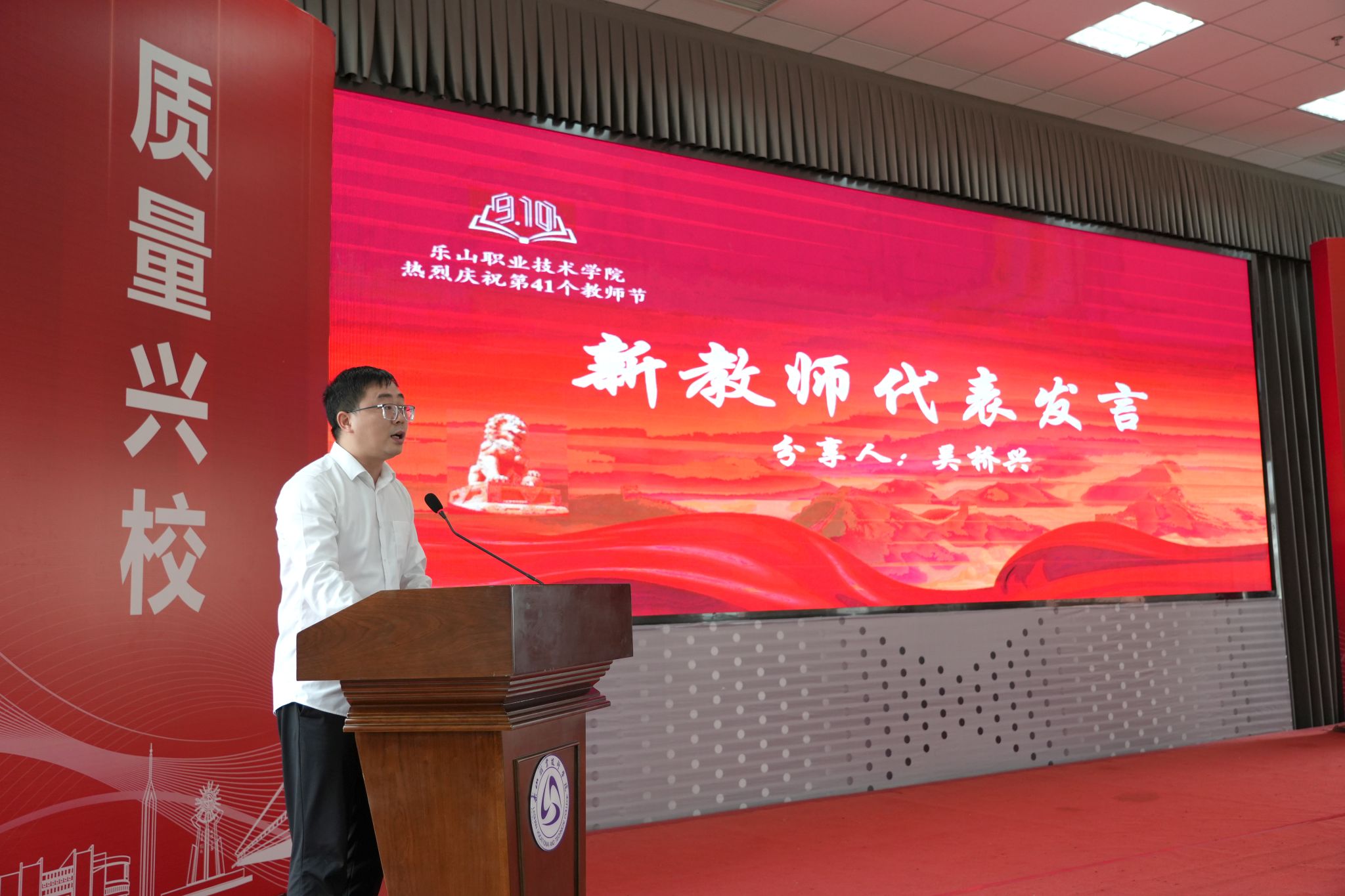 新教师代表、现代农业学院吴桥兴老师在发言中表达了对学校关怀支持的感激之情,并汇报了未来五年在教学、科研、学生培养等方面的规划。他表示将虚心学习、扎实工作,努力成为有理想、有本领、有担当的新时代职教教师。