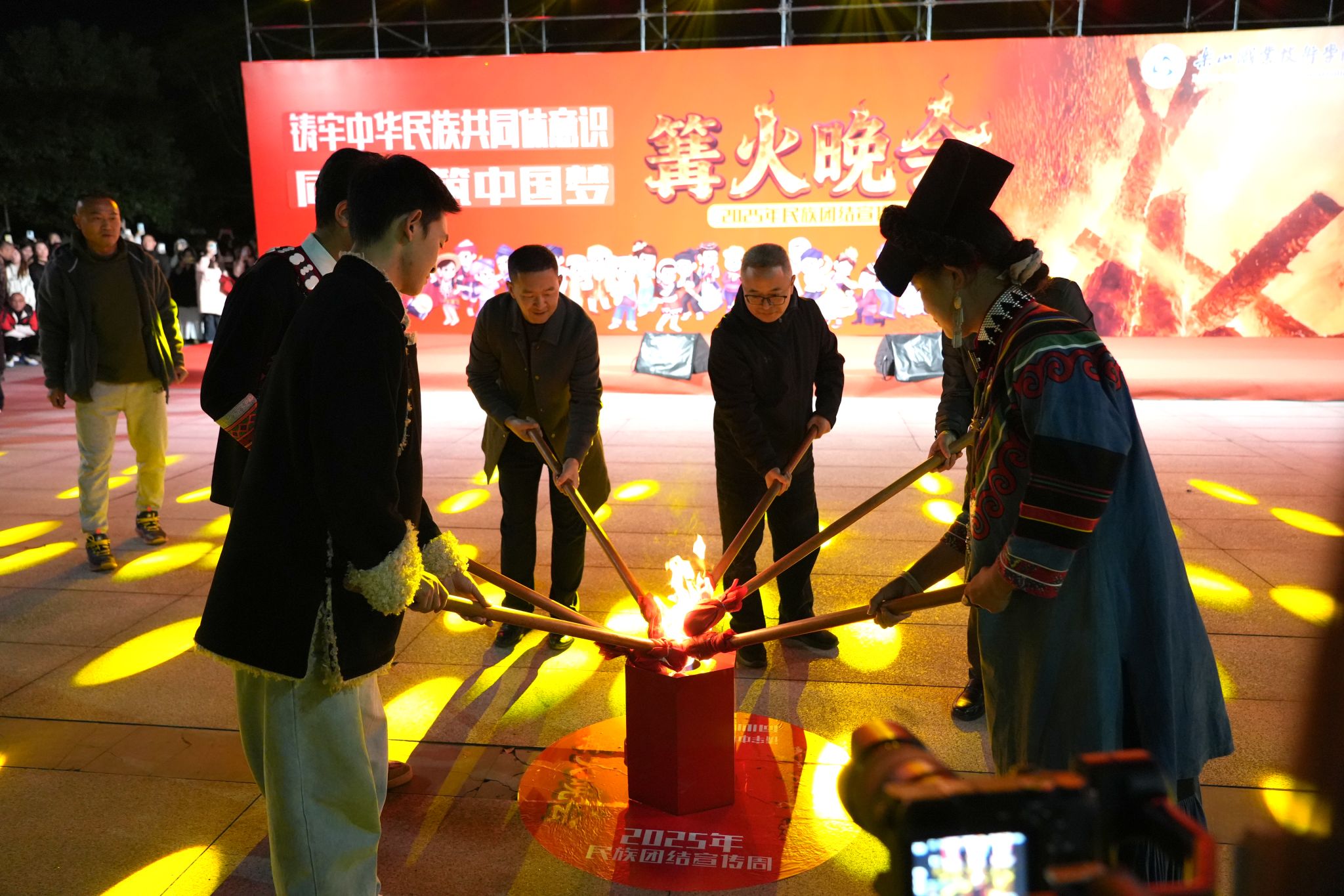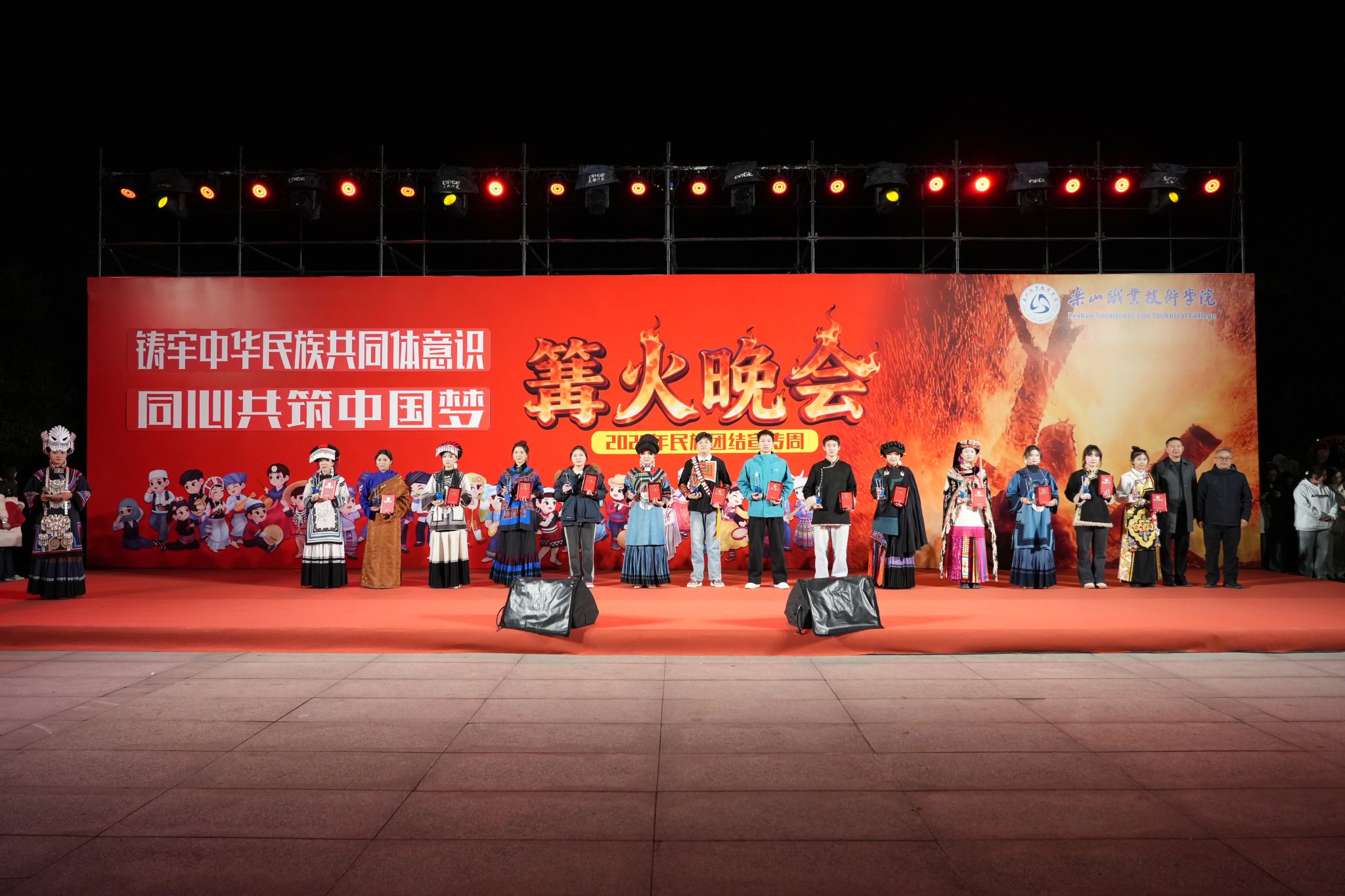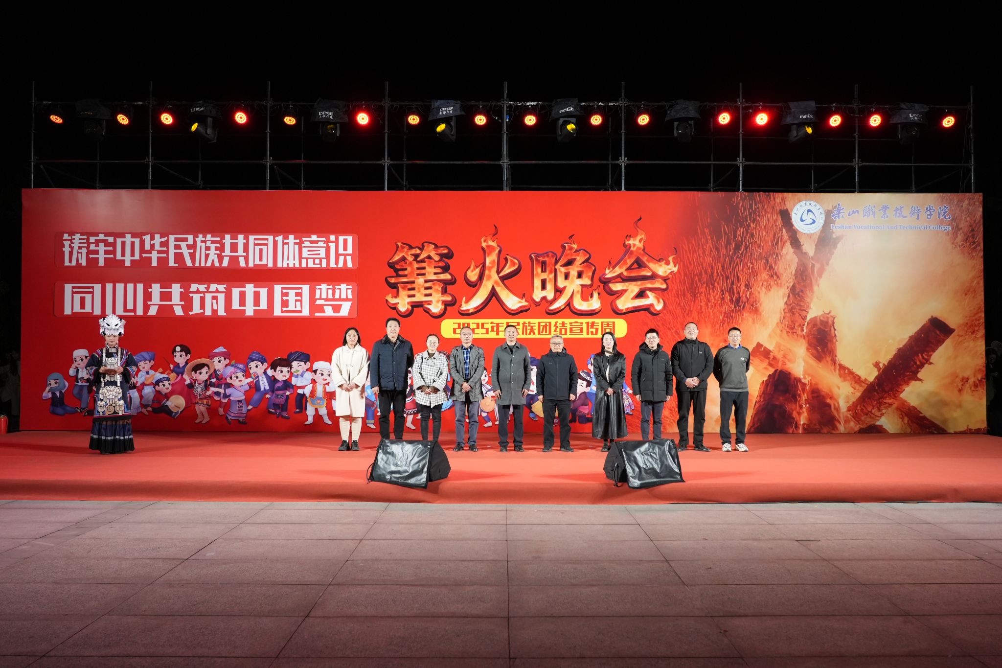 晚餐过后,各民族学生分别聚集在升旗广场和图书馆广场,共同参加“铸牢中华民族共同体意识,同心共筑中国梦”民族团结主题篝火晚会。乐山市民族宗教事务委员会鲁克根喜先生,学校党委委员、副校长张学河出席了活动。晚会期间为获得2025年“优秀少数民族学生”荣誉称号的14名学生颁发了证书和奖杯,并向全体彝族学生送上了新年祝福。