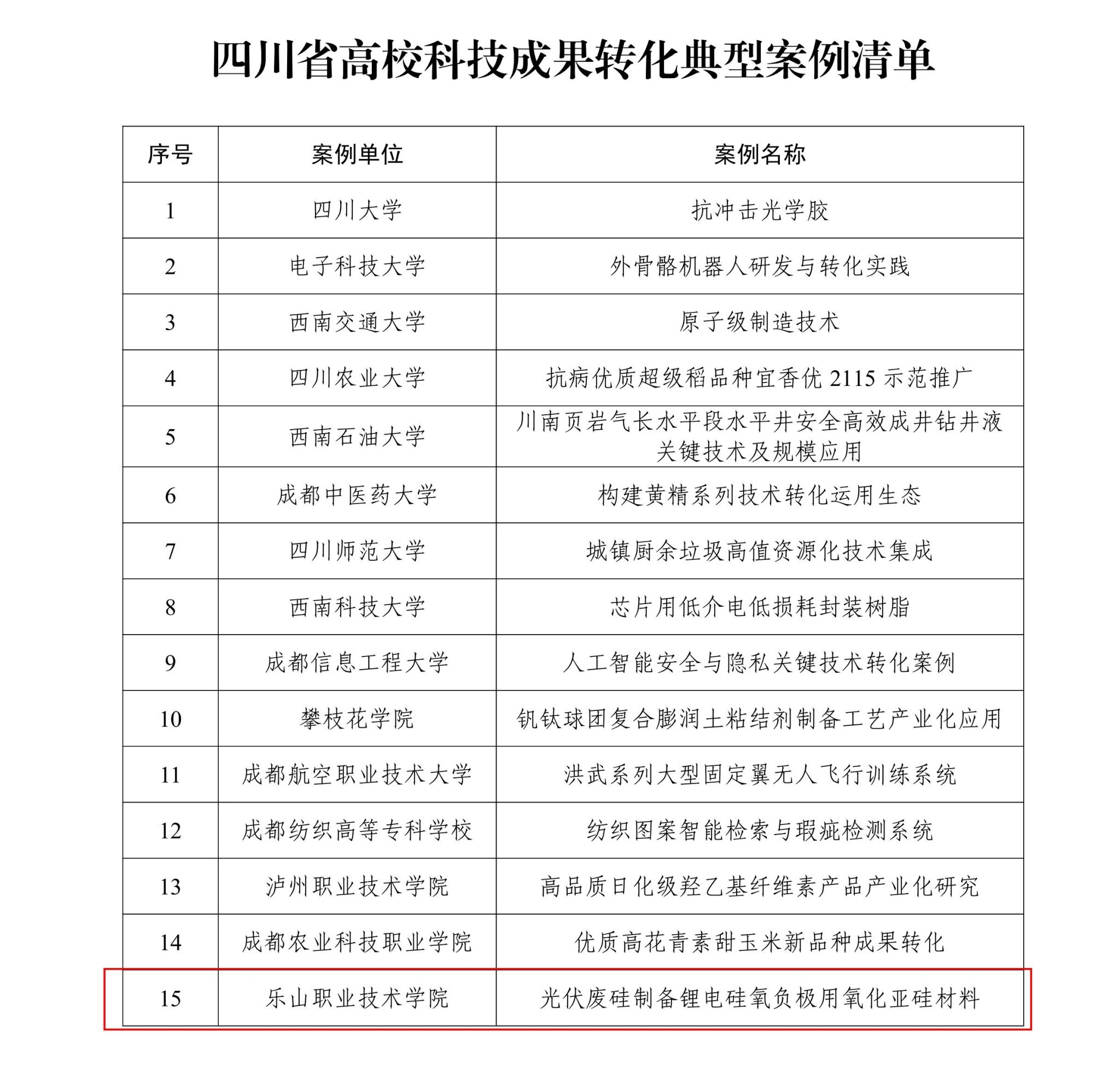 近日,四川省教育厅公布了四川省高校科技成果转化典型案例,全省15所高校的优秀案例入选。学校报送的胡小冬副教授团队“光伏废硅制备锂电硅氧负极用氧化亚硅材料”案例入选,成为高职院校科技成果落地转化的示范样本,并被中国科技网、中国高新网、四川高校科技发展与对外交流公众号等多家媒体报道。