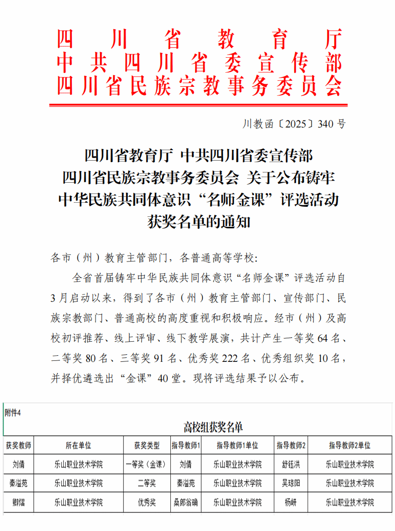 荣誉的背后,是全校上下的同心协力。备赛过程中,学校党委高度重视,分管校领导全程指导;党委统战部统筹后勤保障,教务处协调专家打磨课程;马克思主义学院、素质教育学院积极组织骨干教师参与,通过多轮精细打磨,不断优化课程架构、充实教学内容。参赛教师们凭借深厚的理论素养、新颖的教学设计与鲜活的课堂呈现,最终在省级赛场上脱颖而出。学校将进一步推动铸牢中华民族共同体意识教育与日常教学深度融合,为培养具有共同体意识和民族责任感的新时代人才贡献乐职力量。