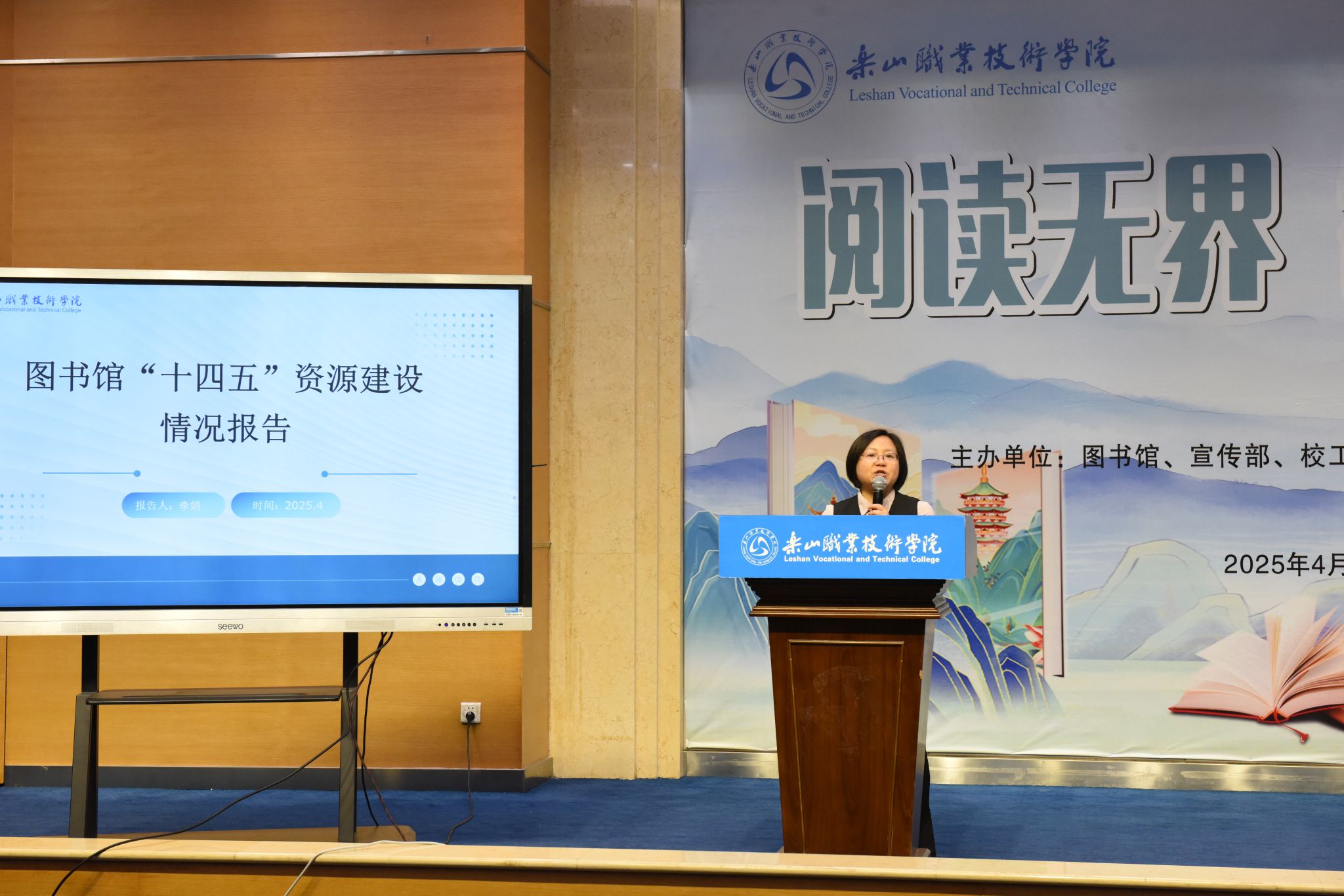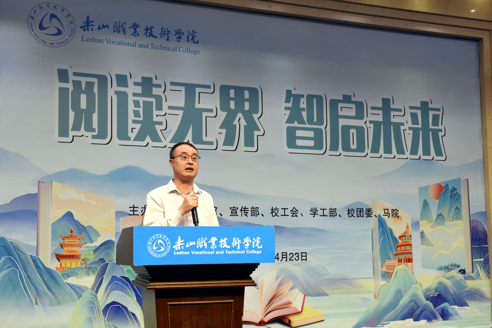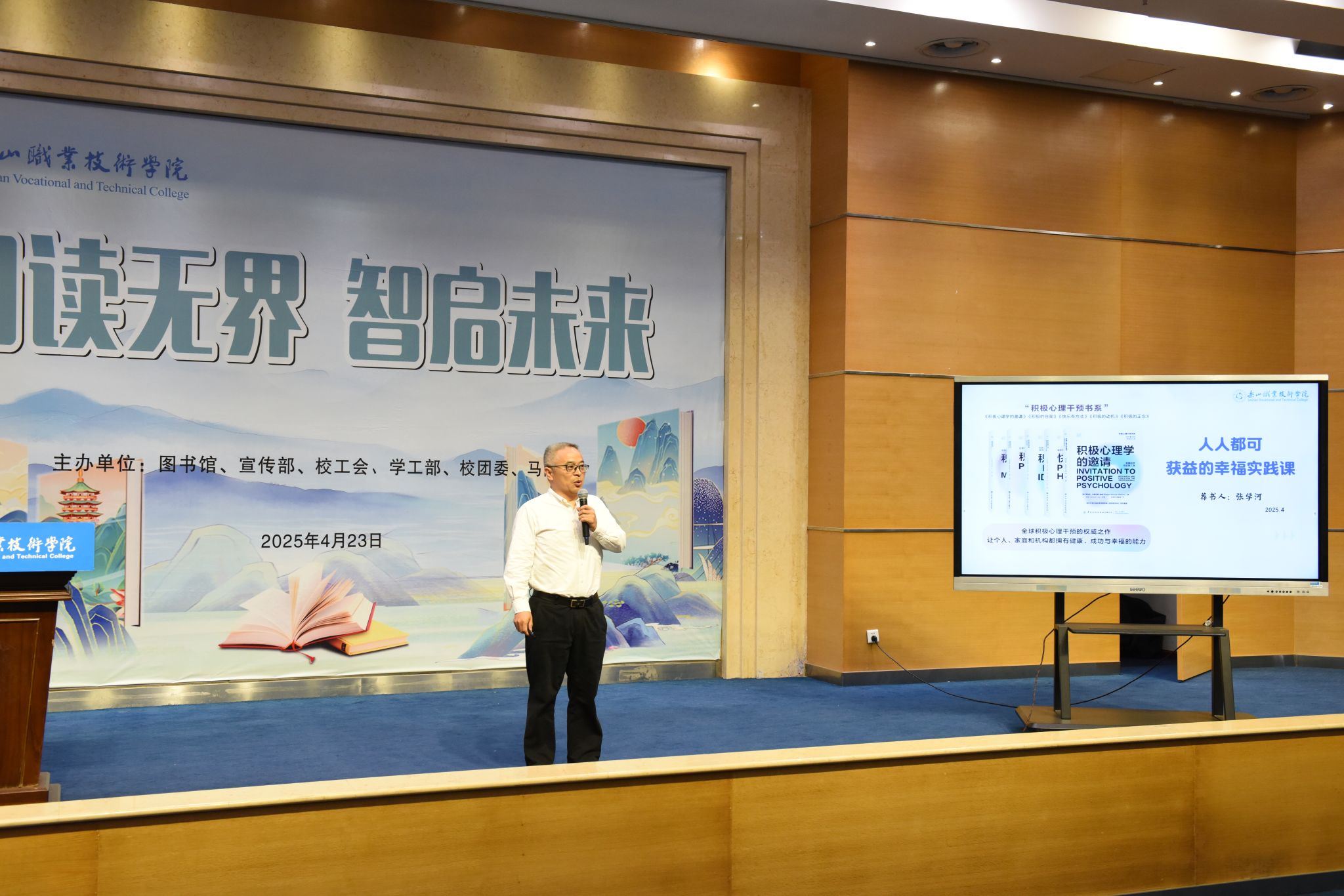4月23日,伟德国际victor1946“阅读无界 智启未来”世界读书日系列活动启动仪式在图书馆学术报告厅举行,拉开了全年阅读推广活动的序幕。校长刘忠,党委委员、副校长张学河,图书馆、宣传部、校工会、学生工作部、校团委、马克思主义学院相关负责人与近500名师生代表参加启动仪式。
