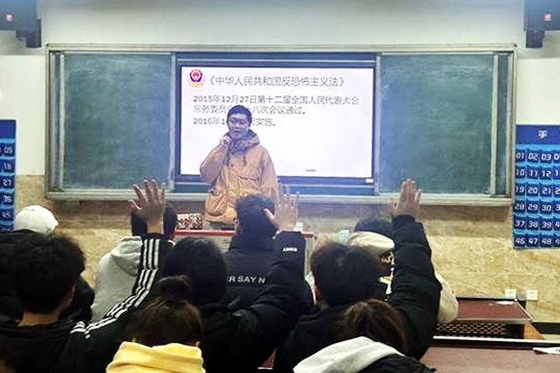在活动中,辅导员结合PPT讲解、视频播放和现场演示等多种形式,为学生们深入剖析了恐怖主义的本质、类型以及应对方法。不仅详细介绍了《中华人民共和国反恐怖主义法》的相关内容,还重点讲解了自防自救的“逃躲战”策略,包括在遭遇恐怖袭击时的逃跑、躲藏和战斗技巧。同时,学生们还学习了如何防范校园内的其他暴恐袭击,如防冲撞和防爆炸等安全知识。