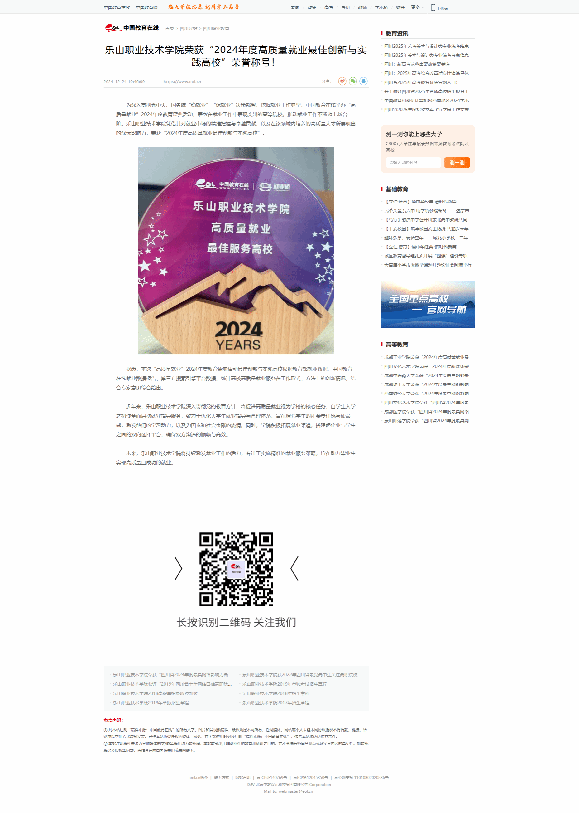 中国教育战线:伟德国际victor1946荣获“2024年度高质量就业最佳创新与实践高校”荣誉称号!