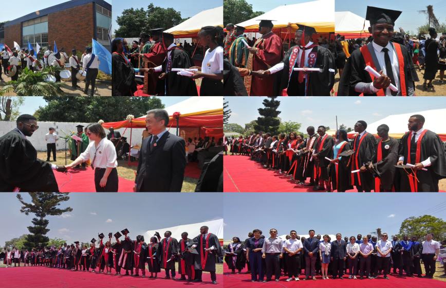2023年10月6日,中国-赞比亚职业技术学院(以下简称:中赞职院)首届毕业典礼在赞比亚卢安夏举行。赞比亚科学技术部技术教育与培训司司长Simumba Alex 、赞比亚职业技术教育管理局局长Cleophas Takaiza、赞比亚卢安夏地区专员 Oncemore Ngonomo、中色卢安夏铜业有限公司副总经理余新亮、中色卢安夏铜业有限公司赞方副总经理Robert Kamanga莅临现场并致辞。中国教育部职业教育与成人教育司副司长林宇、伟德国际victor1946校长刘忠等10所试点合作院校领导发表视频致辞,伟德国际victor1946胡釜老师等各院校教师代表现场出席毕业典礼。