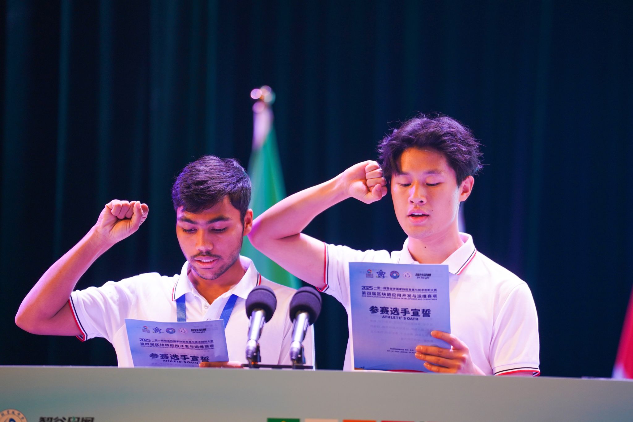 中国参赛选手代表张星星、国际组参赛选手代表法沙上台宣誓。他们表示,这不仅是一场职业技能的较量,更是对专业技能、团队协作能力和视野的一次全面检验,在本次比赛中将遵守规则,发挥最佳水平。