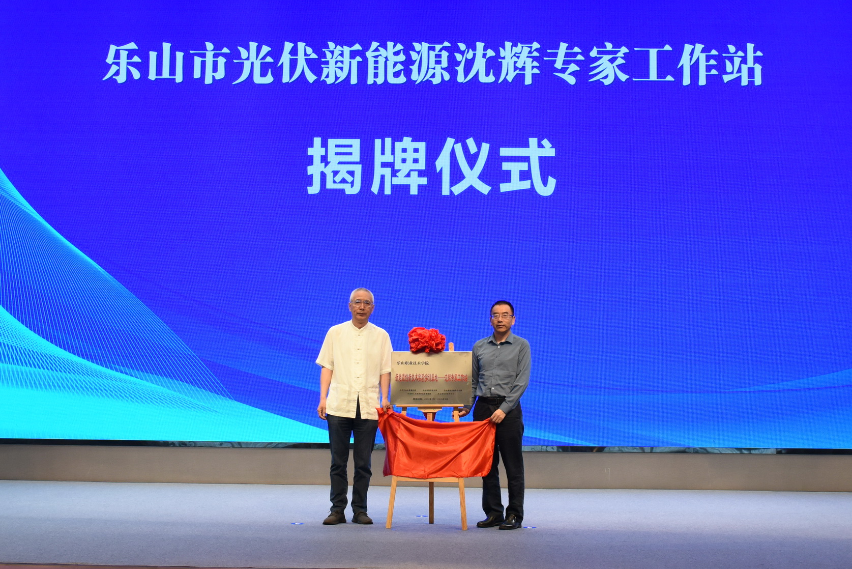 长三角太阳能光伏技术创新中心主任、中国绿色供应链联盟光伏专委会主任沈辉教授,乐山市科学技术协会党组书记左尔钊为“新能源创新技术实验实训基地沈辉专家工作站”揭牌。