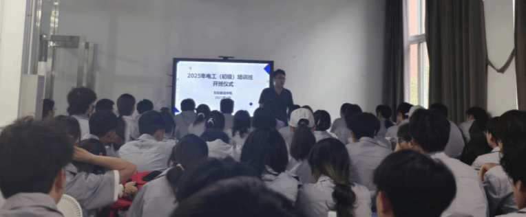 2025年4月22日,智能制造学院在四号工厂2楼工业机器人系统集成实训室举行2025年电工(初级)培训班开班仪式,本次培训旨在培养智能制造专业群学生具备初级电工系统理论知识,同时达到行业要求的技能标准,以便毕业后从事电气安装到工业自动化系统维护等多层次岗位,拓展就业范围。