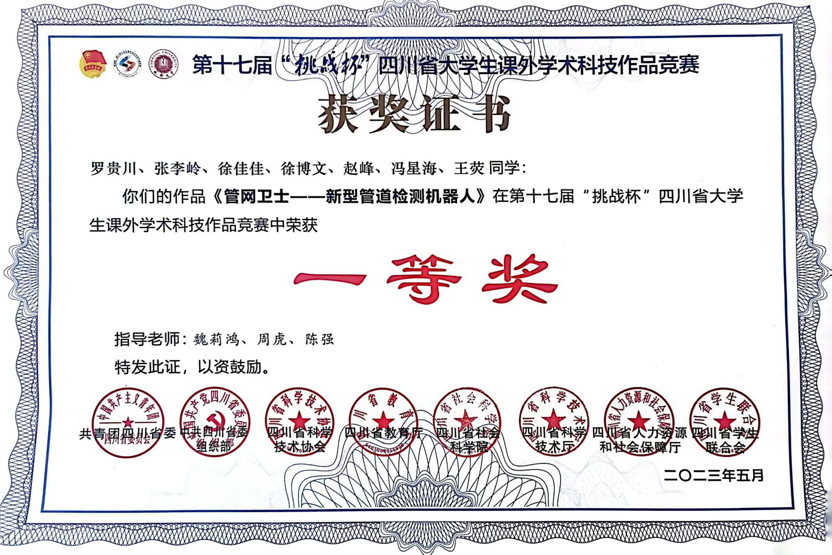 近日,我院罗贵川等7名学生在魏莉鸿、周虎、陈强三位老师的精心指导下,参赛作品《管网卫士—新型管道检测机器人》在四川省第十七届“挑战杯”大学生课外学术科技作品竞赛中斩获一等奖。该项成绩是伟德国际victor1946近年来在“挑战杯”大学生课外学术科技作品中取得的历史最好成绩,实现了赛事重大突破。