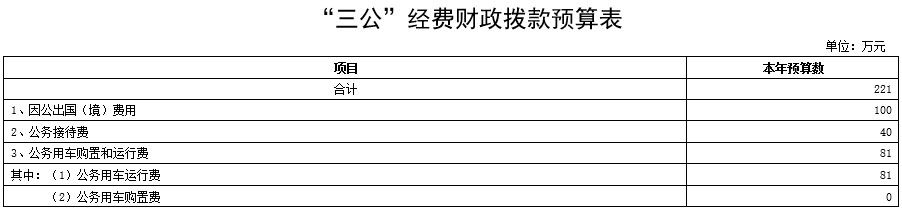 2016年“三公”经费财政拨款预算数221万元,其中:因公出国(境)经费100万元,公务接待费40万元,公务用车购置及运行维护费81万元。