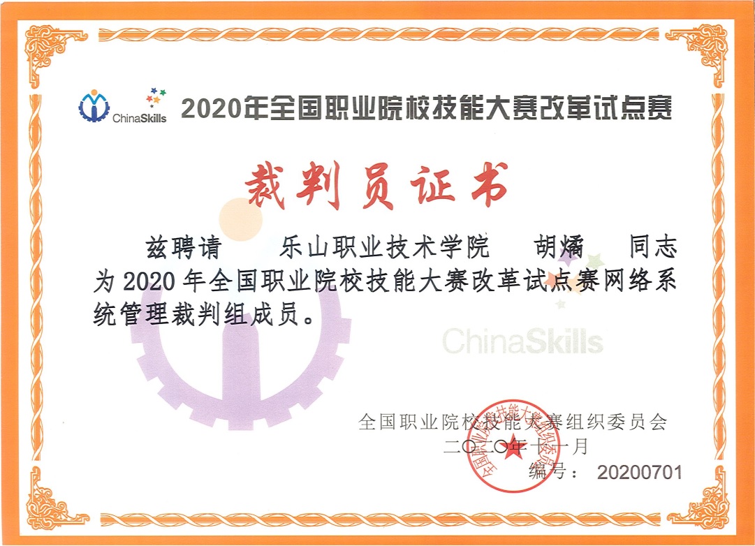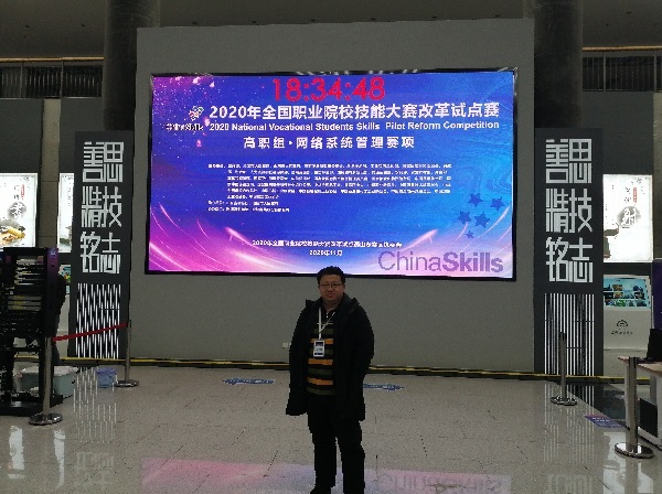 2020年11月24日-29日,由教育部、国家发展和改革委员会、科学技术部、工业和信息化部、民政部、财政部、人力资源和社会保障部等部门主办,山东省教育厅、淄博市人民政府承办,淄博职业学院、锐捷网络股份有限公司协办的2020年全国职业院校技能大赛改革试点赛“高职组•网络系统管理赛项”在山东省淄博市隆重举行。我院教师胡燏有幸成为全国24名执裁中的一员,全程参与了整个赛事的裁判工作。